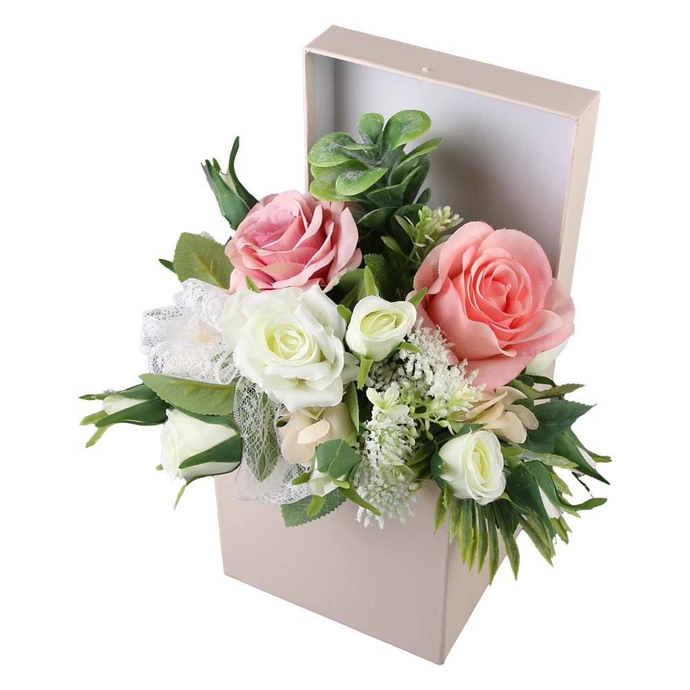 Aranjament floral cu trandafiri in cutie, 28 cm, fundita din dantela