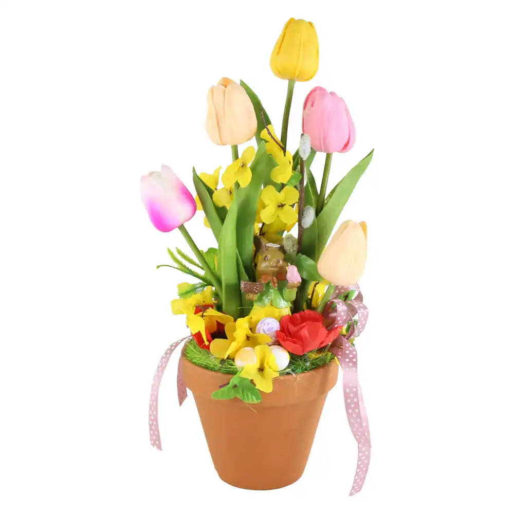 Aranjament floral de Paste cu Iepuras si lalele 32 CM
