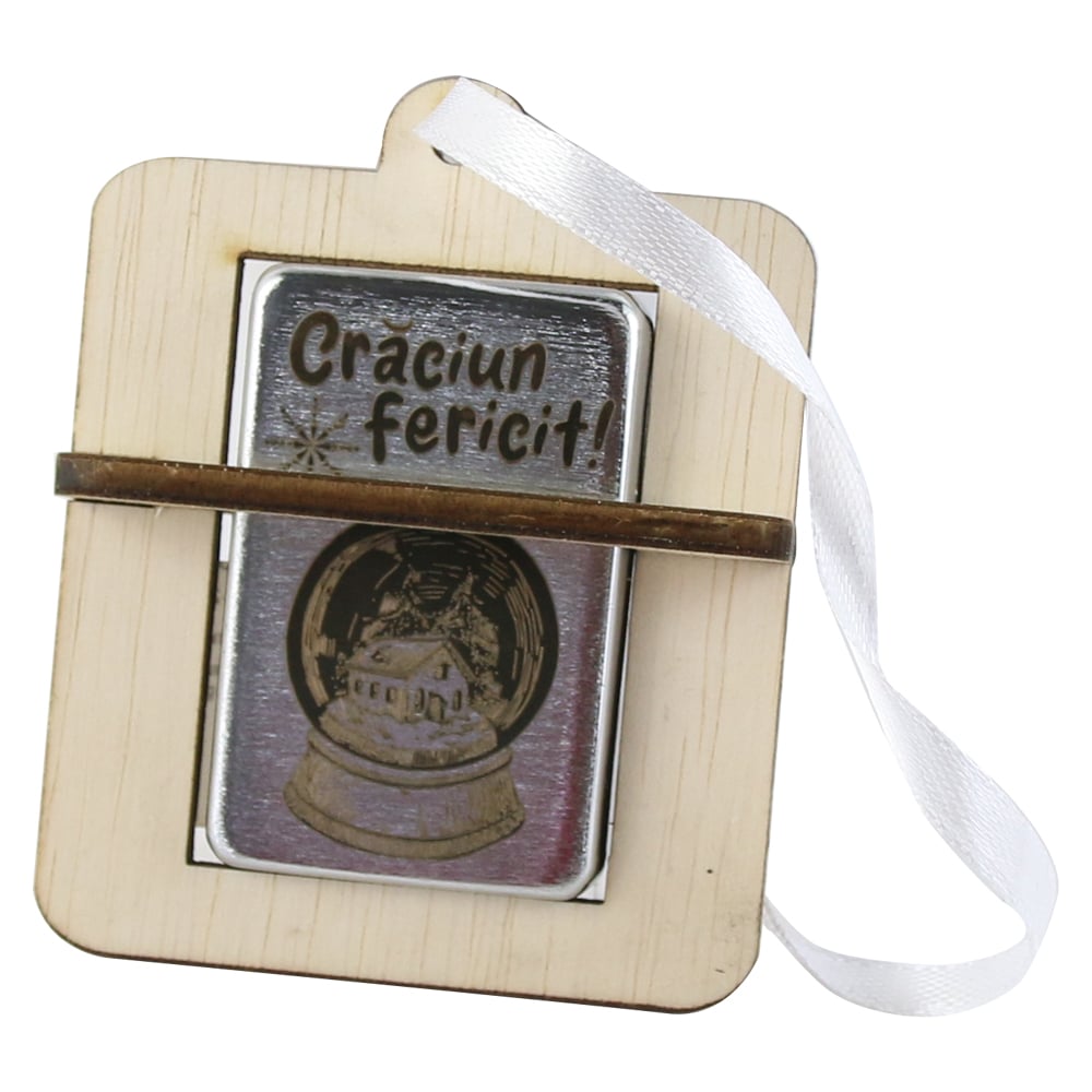 Bricheta metalica cu suport din lemn „Craciun fericit”, glob nins