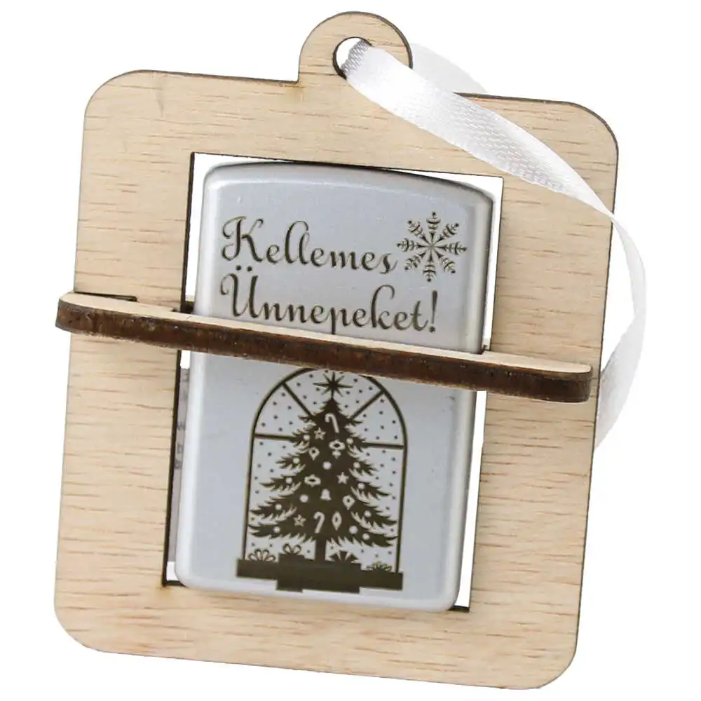 Bricheta metalica cu suport din lemn „Kellemes Unnepeket”, cu gravura laser, brad