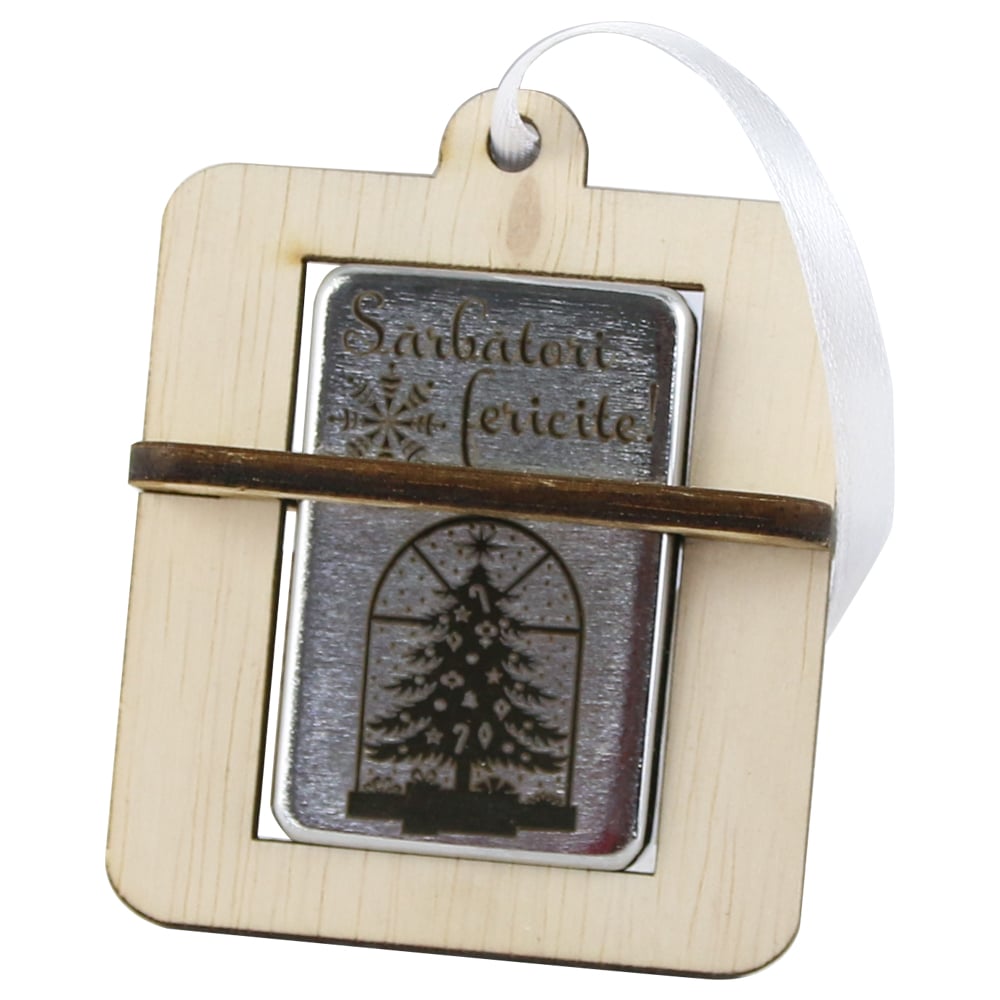 Bricheta metalica cu suport din lemn „Sarbatori fericite”, brad