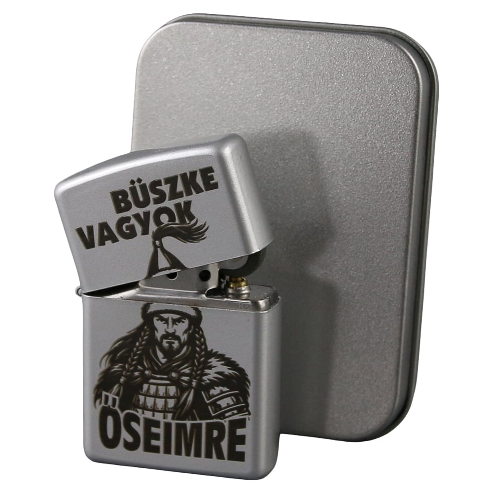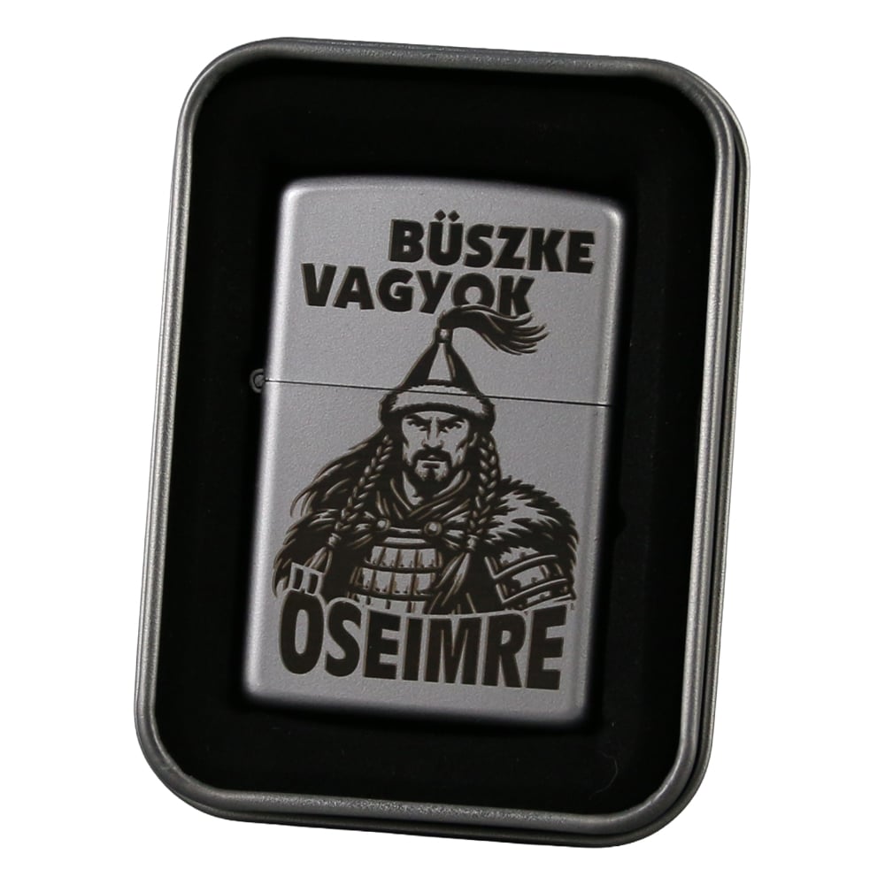 Bricheta metalica gravata „Buszke vagyok az Oseimre” 3.5 x 5.5 cm, argintiu