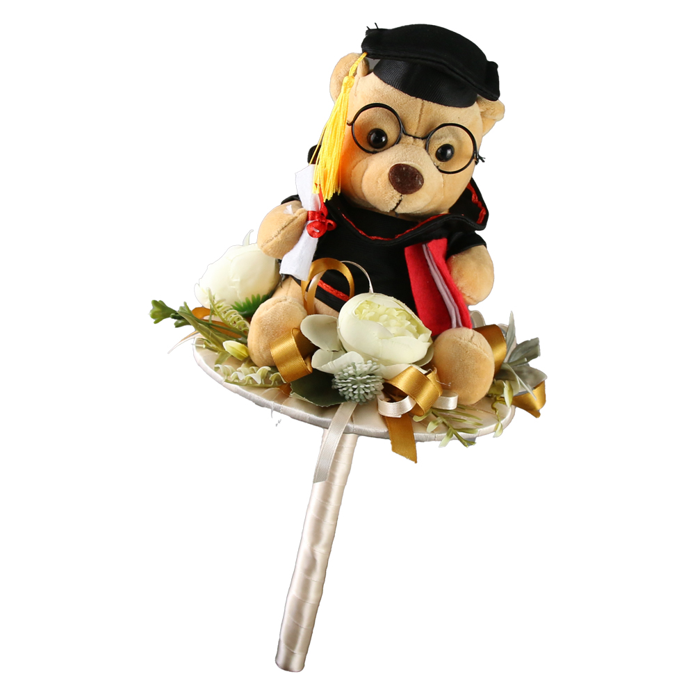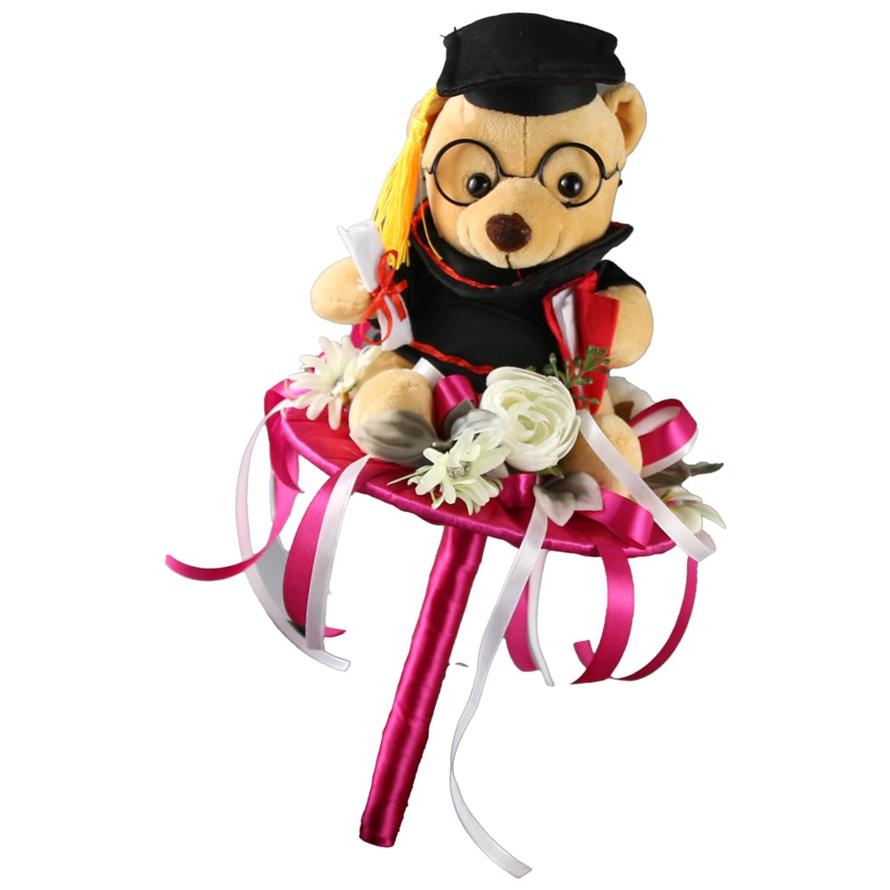 Buchet floral decorativ pentru absolventi, cu ursulet, inaltime 36 cm. Ideal pentru cadou de absolvire sau decor festiv.