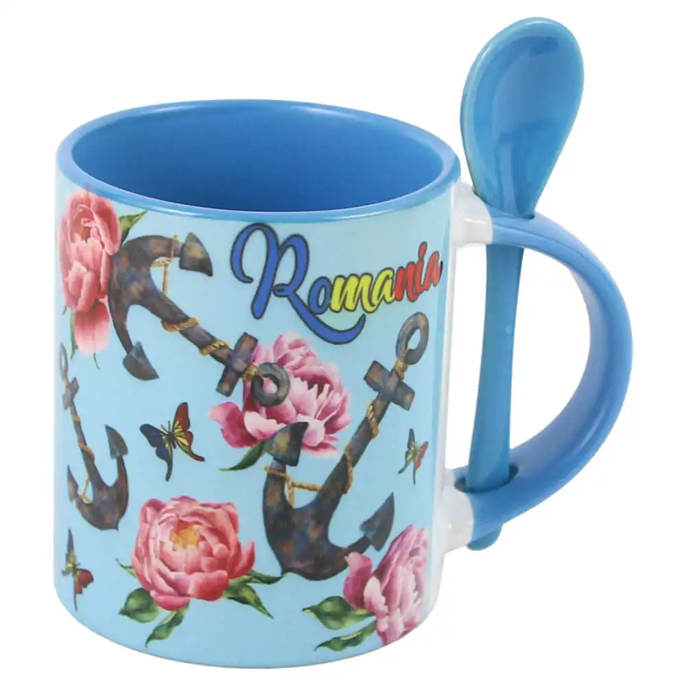 Cana ceramica cu lingurita, 330 ml, „Romania”, Ancora, albastru