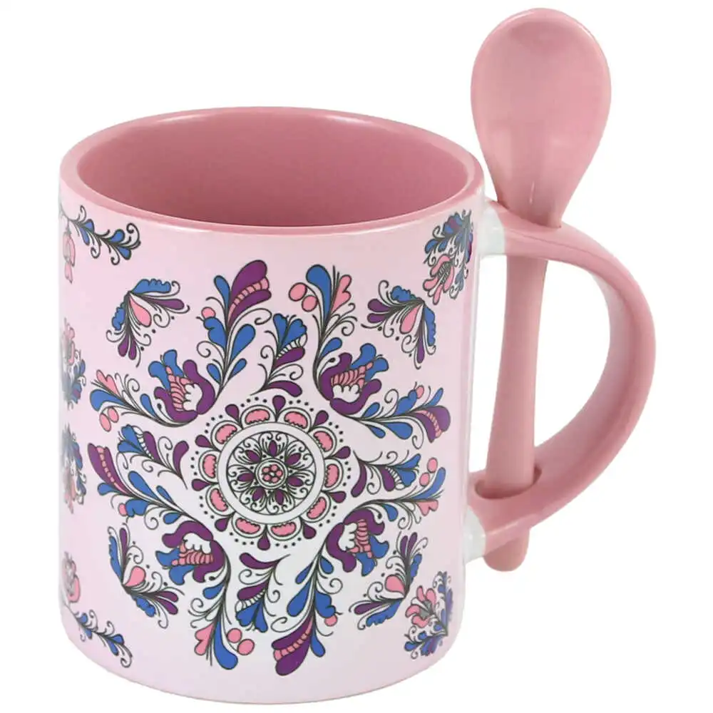 Cana ceramica cu lingurita, 330 ml, Roz, motive traditionale Corund