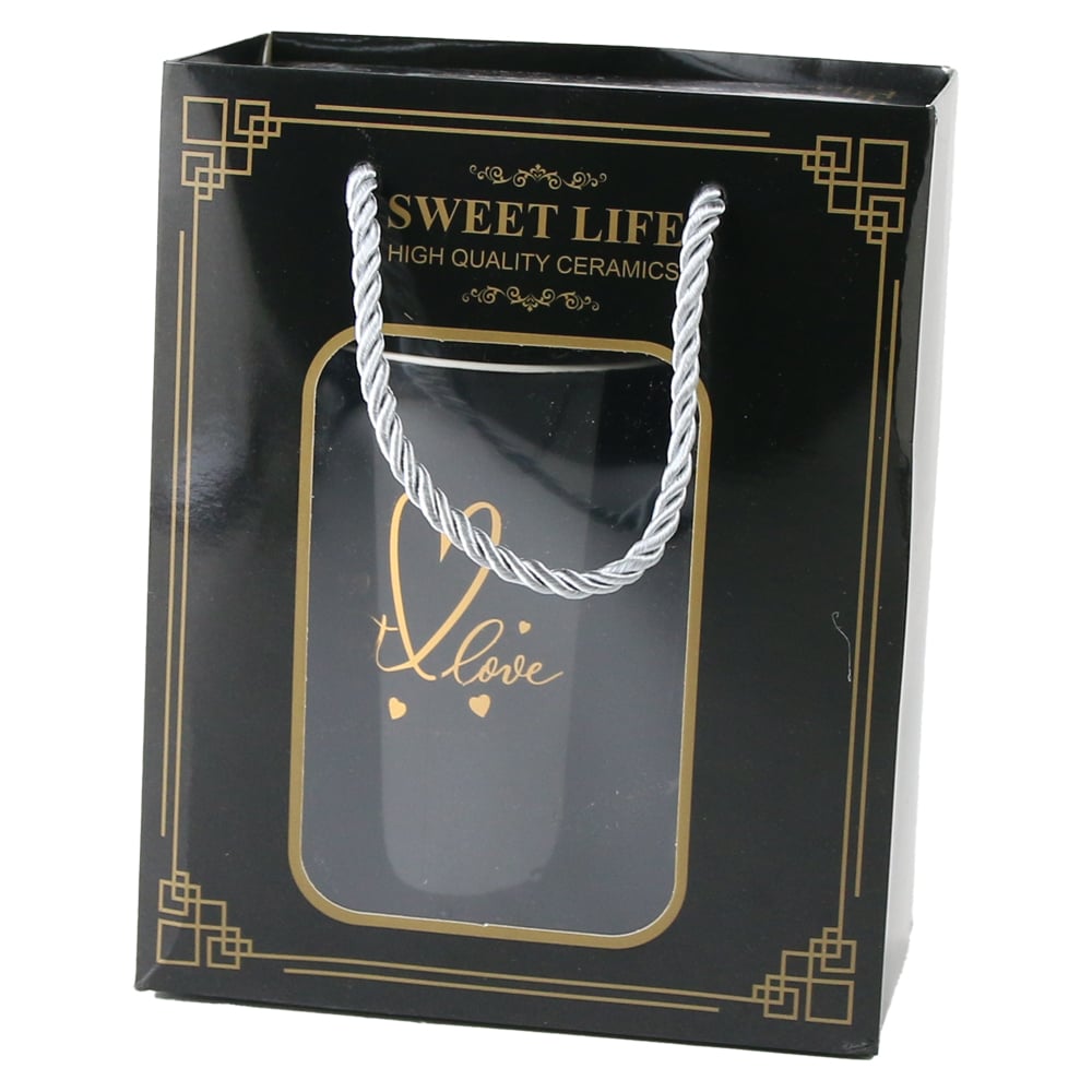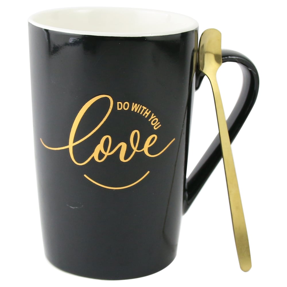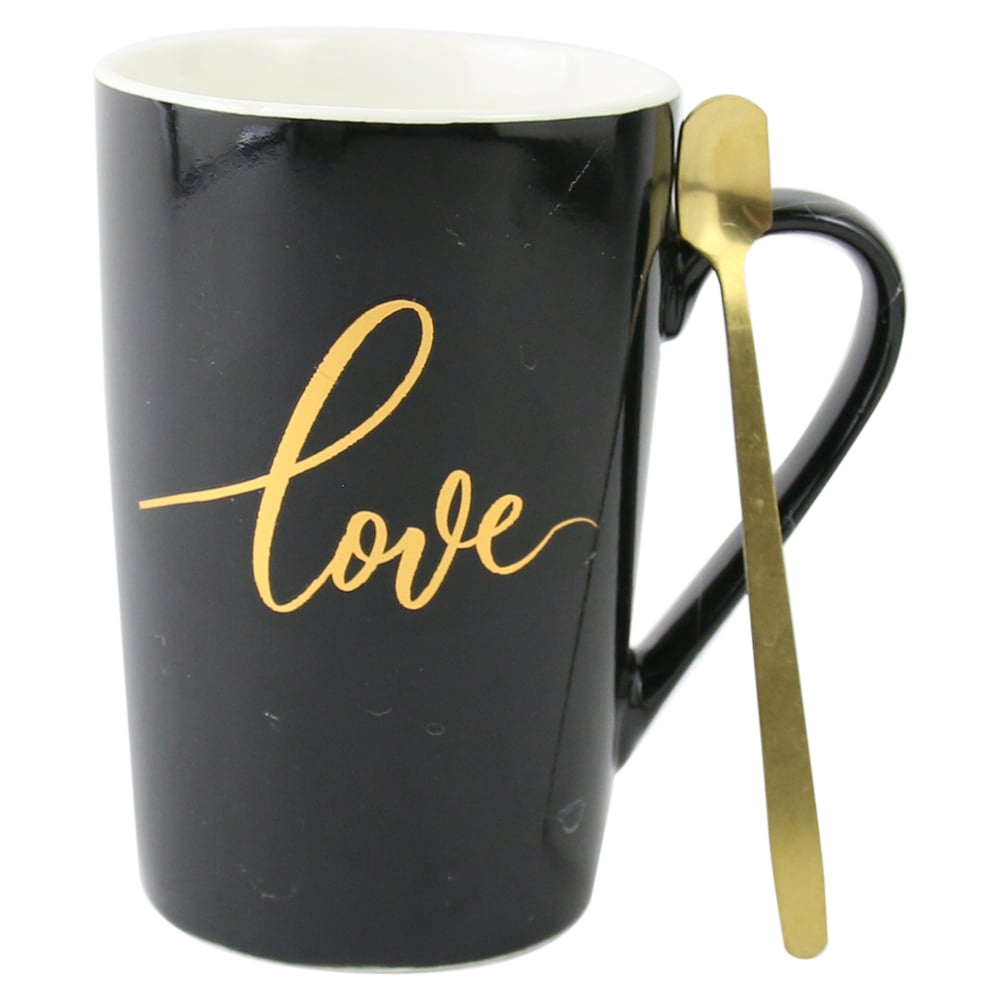 Cana ceramica cu lingurita metalica „Love”, 400 ml – Negru/auriu