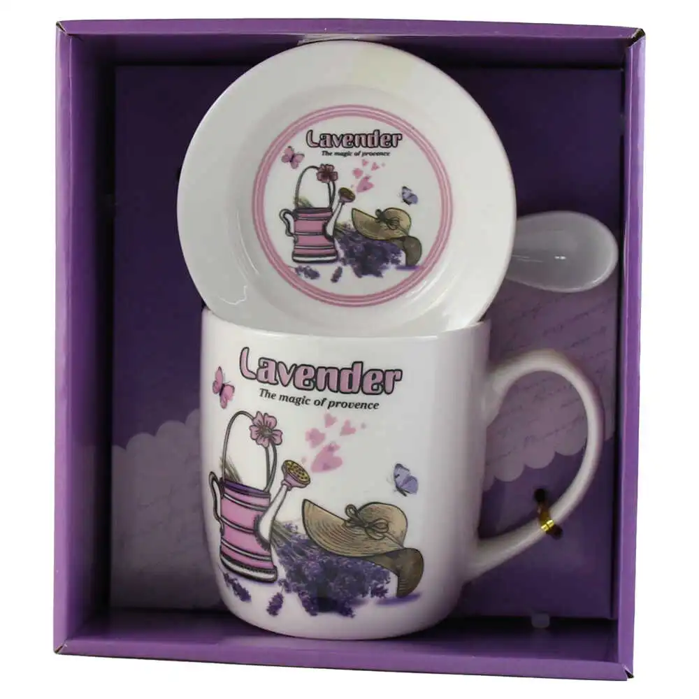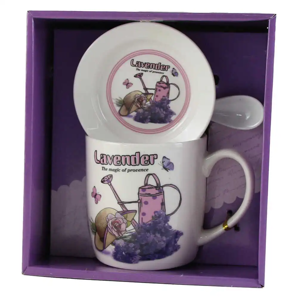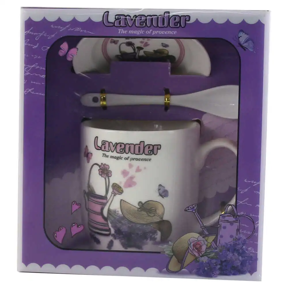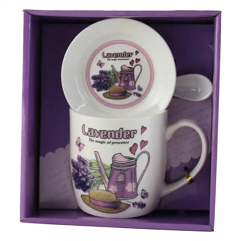 Cana cu farfurie si lingurita, din ceramica, in cutie decorativa „Lavander, the magic of provence”