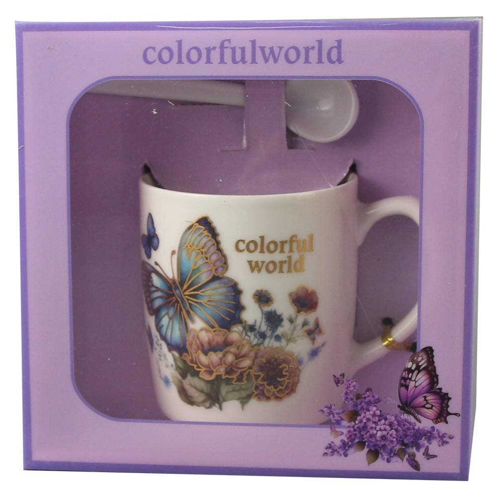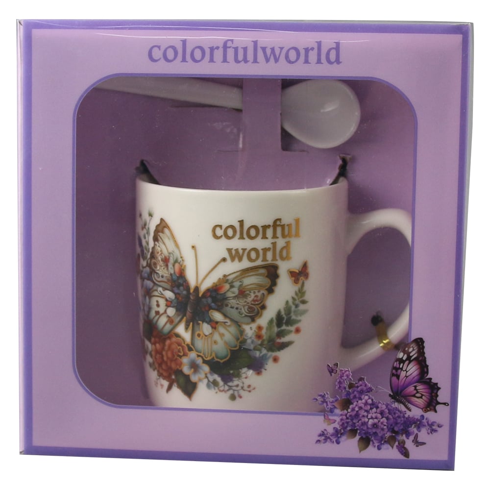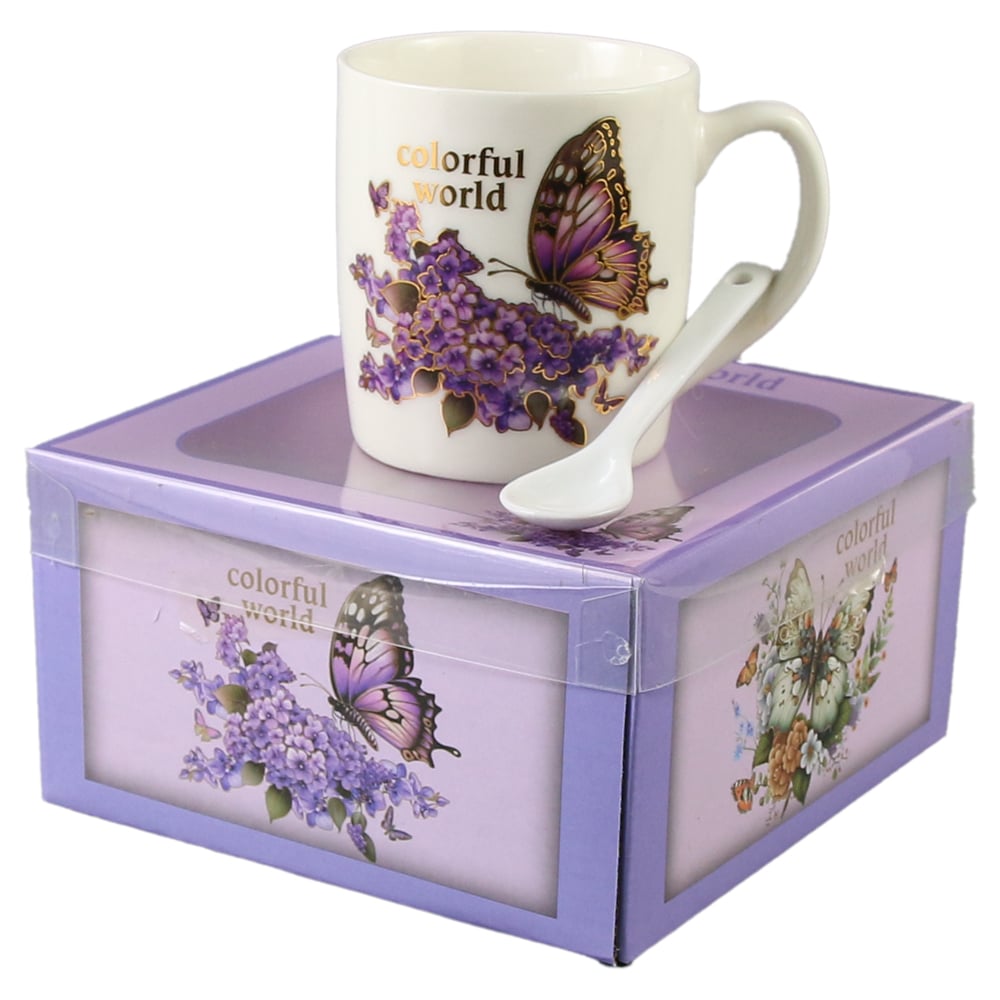 Cana cu lingurita, din ceramica „Colorful World” 200 ml, Fluturasi