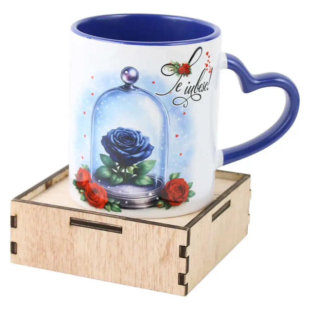 Cana cu suport din lemn 330 ml, „Te iubesc”, trandafiri albastri