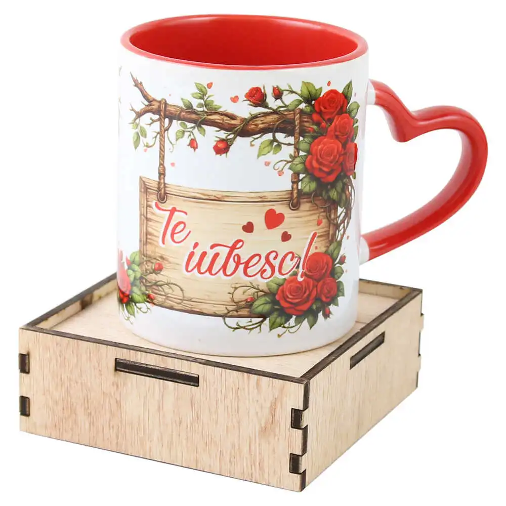 Cana cu suport din lemn 330 ml, „Te iubesc”, trandafiri rosii