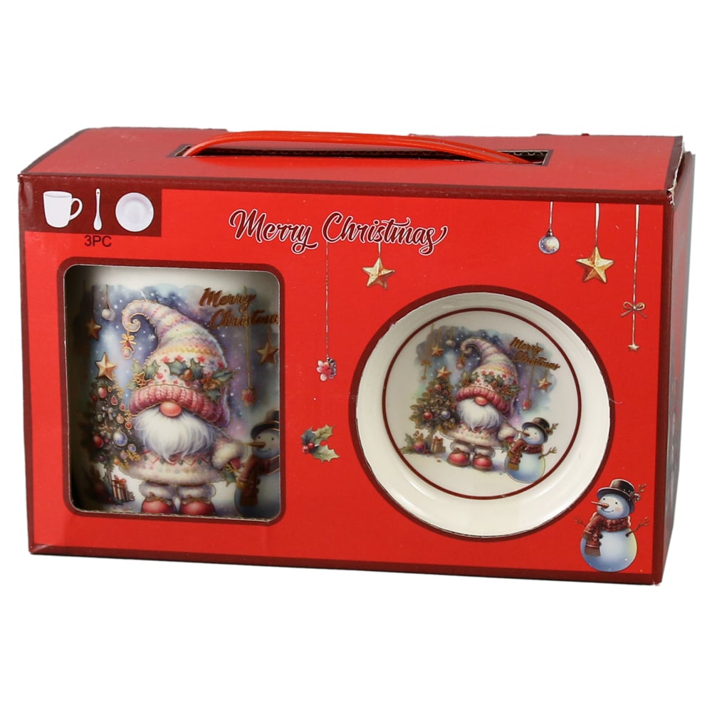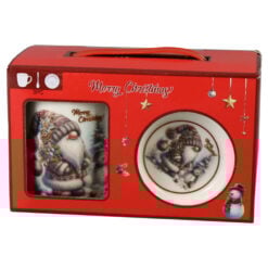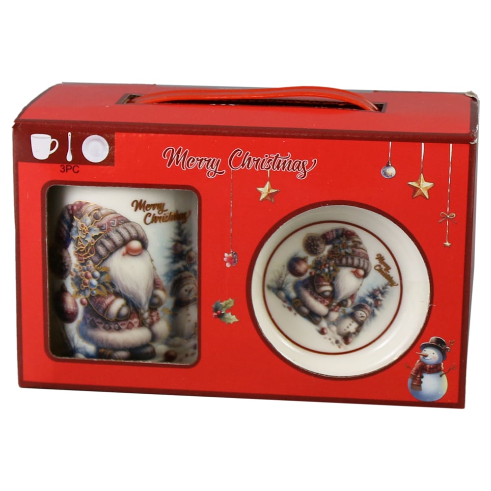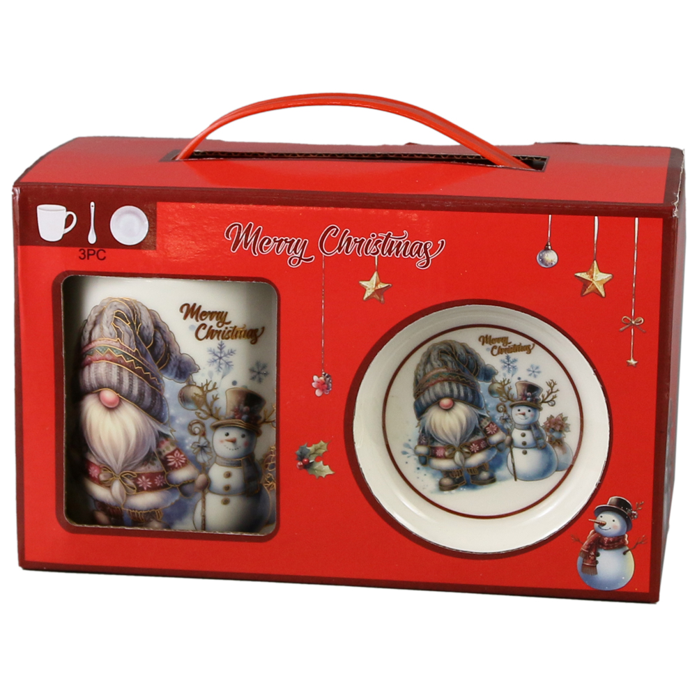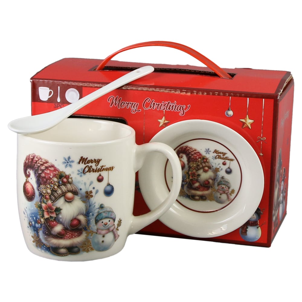 Cana de Craciun cu farfurie si lingurita, din ceramica, 300 ml, „Merry Christmas””, Mos cu om de zapada