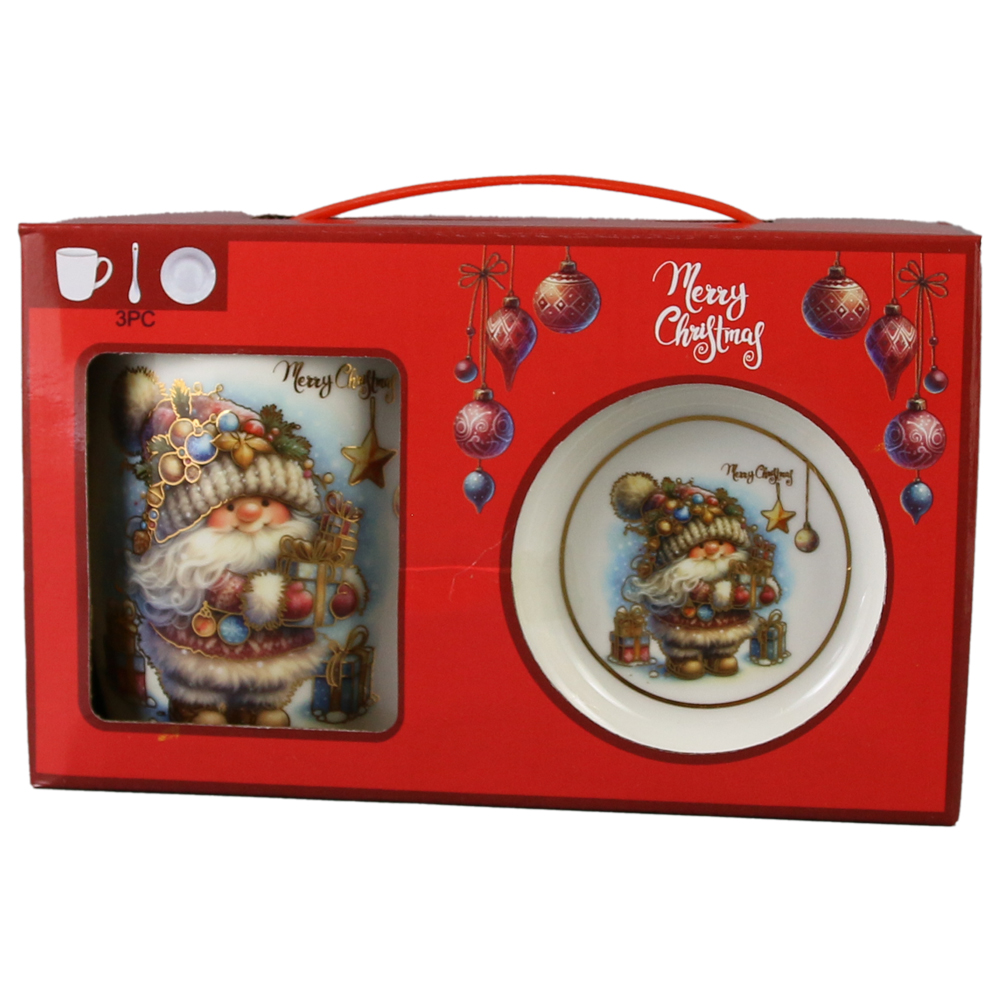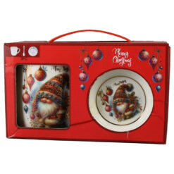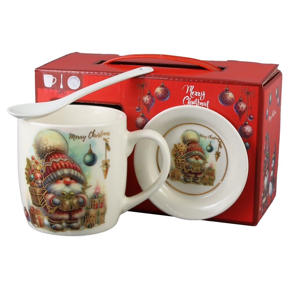 Cana de Craciun cu farfurie si lingurita, din ceramica, 300 ml, „Merry Christmas””, Mos