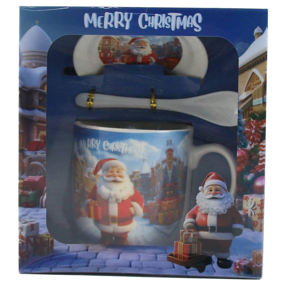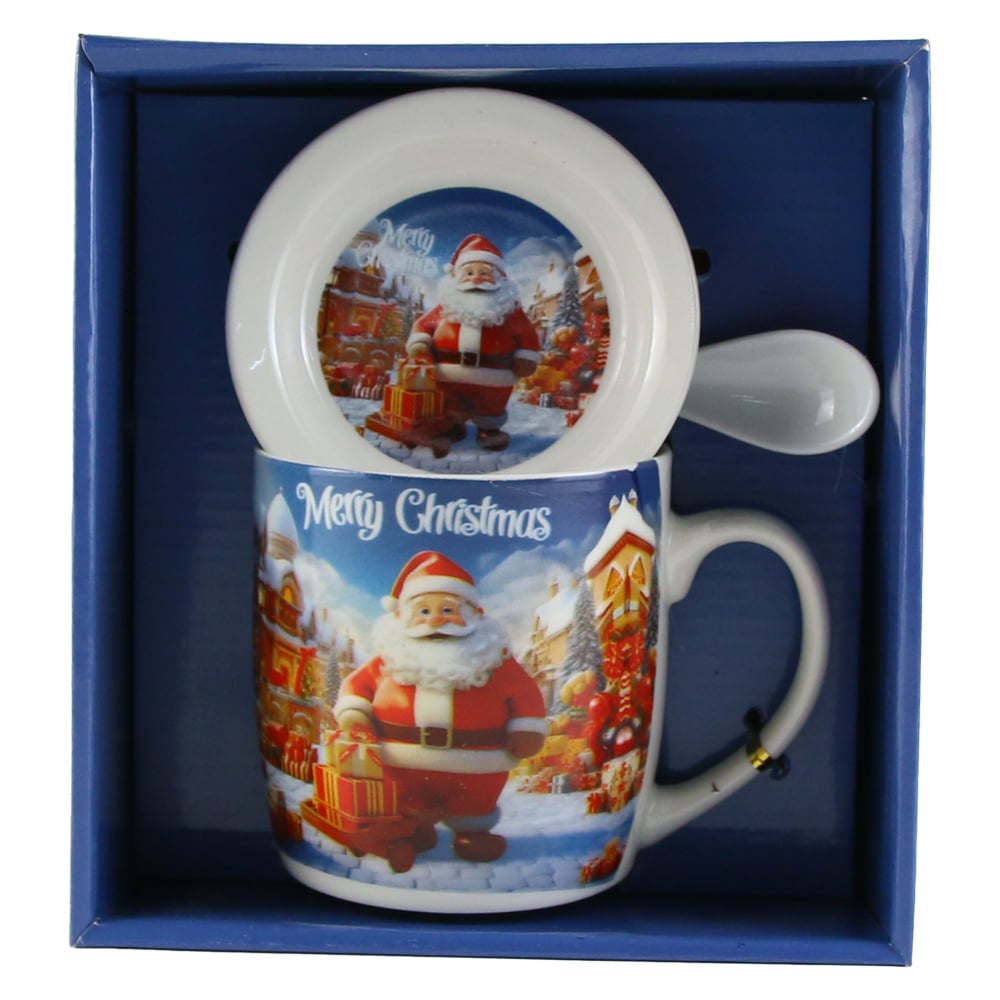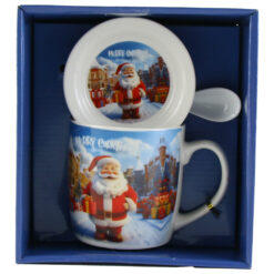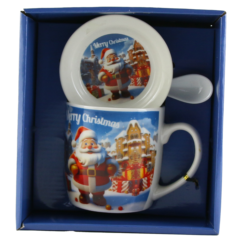 Cana de Craciun cu farfurie si lingurita, din ceramica, „Merry Christmas”, 9 CM, albastru