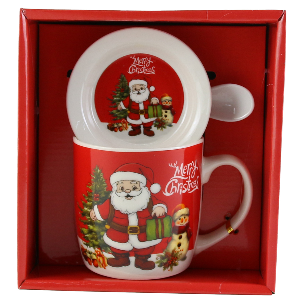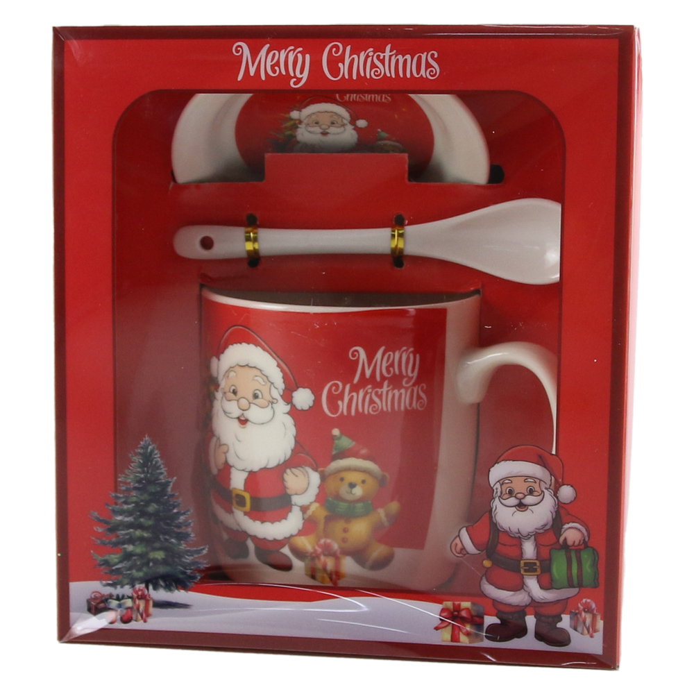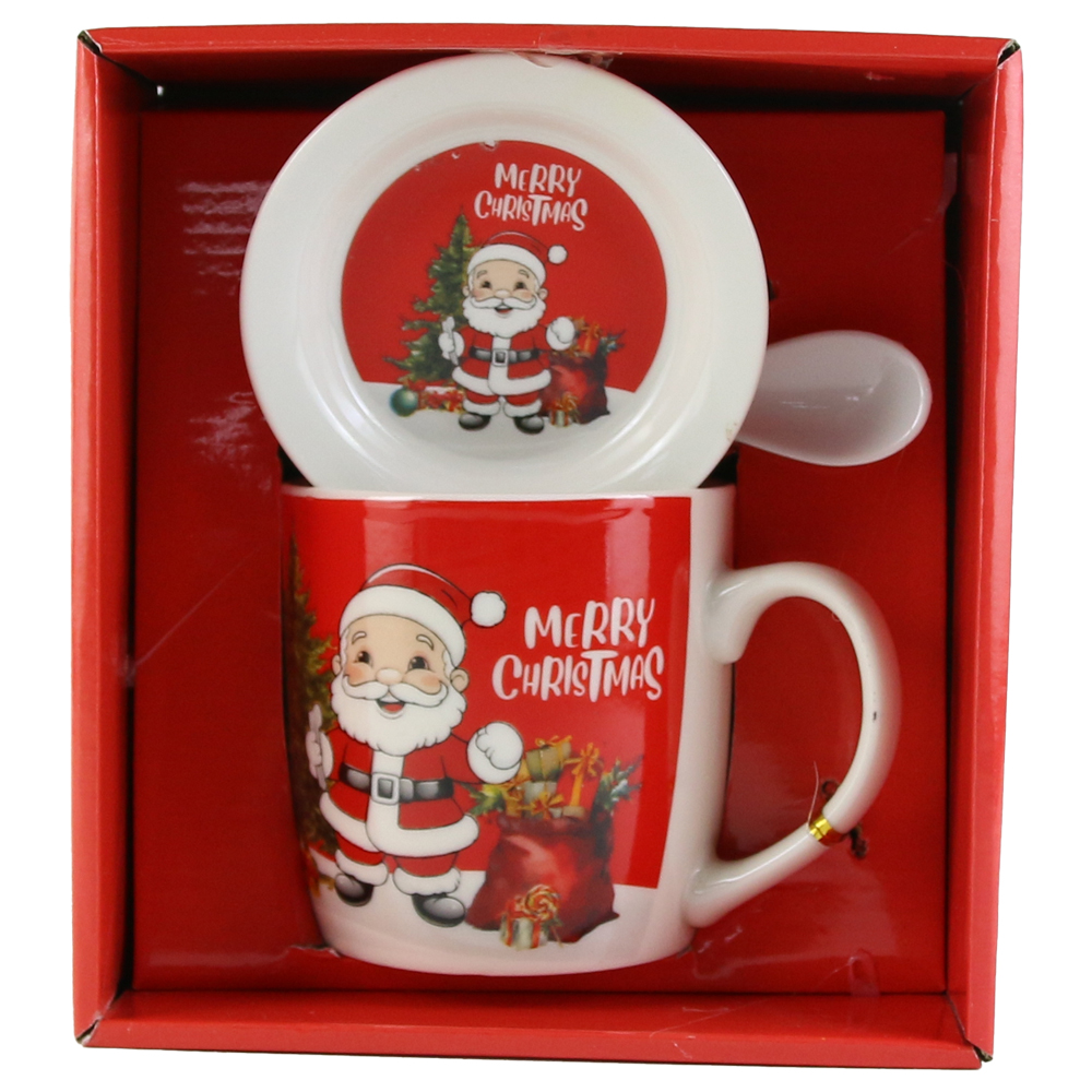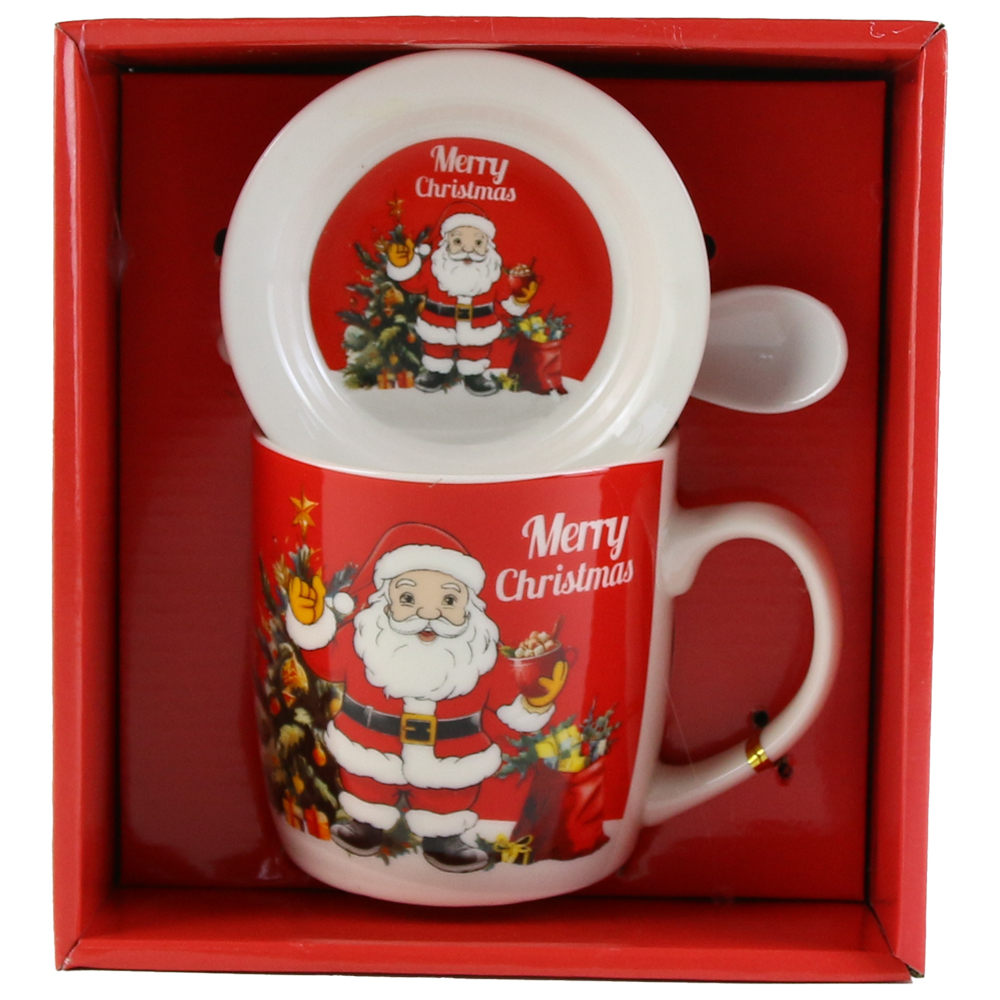 Cana de Craciun cu farfurie si lingurita, din ceramica, „Merry Christmas”, Mos Craciun cu cadouri
