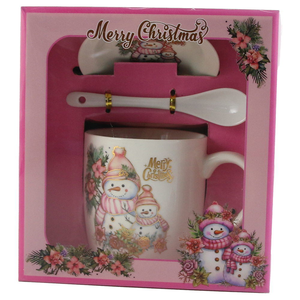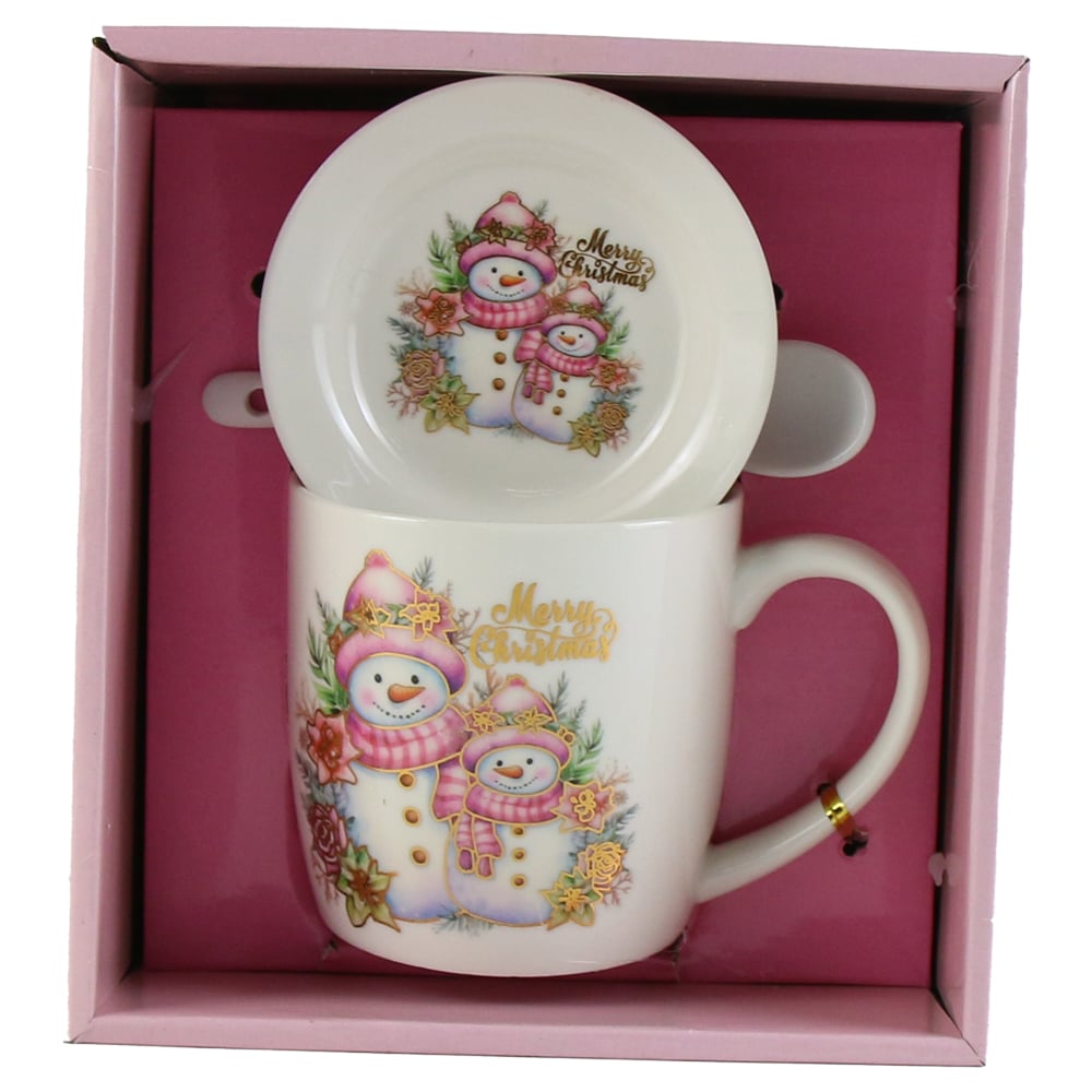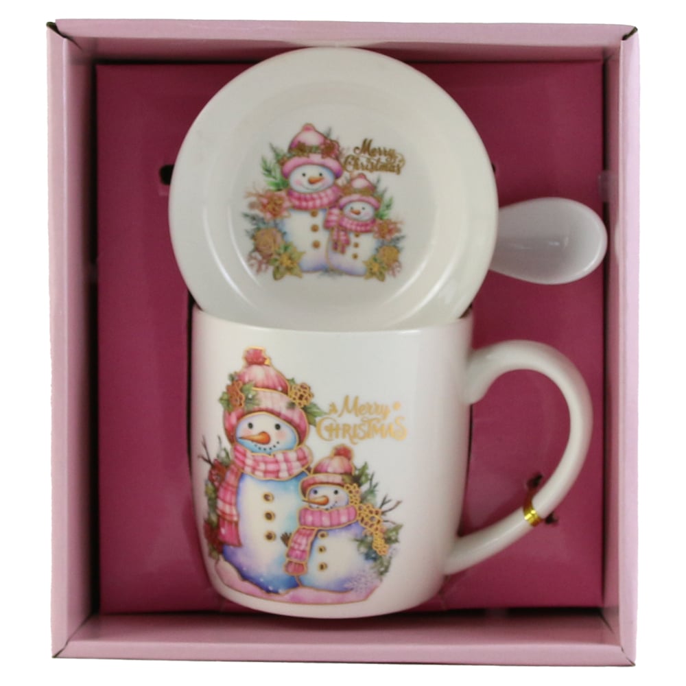 Cana de Craciun cu farfurie si lingurita, din ceramica, Om de zapada, roz