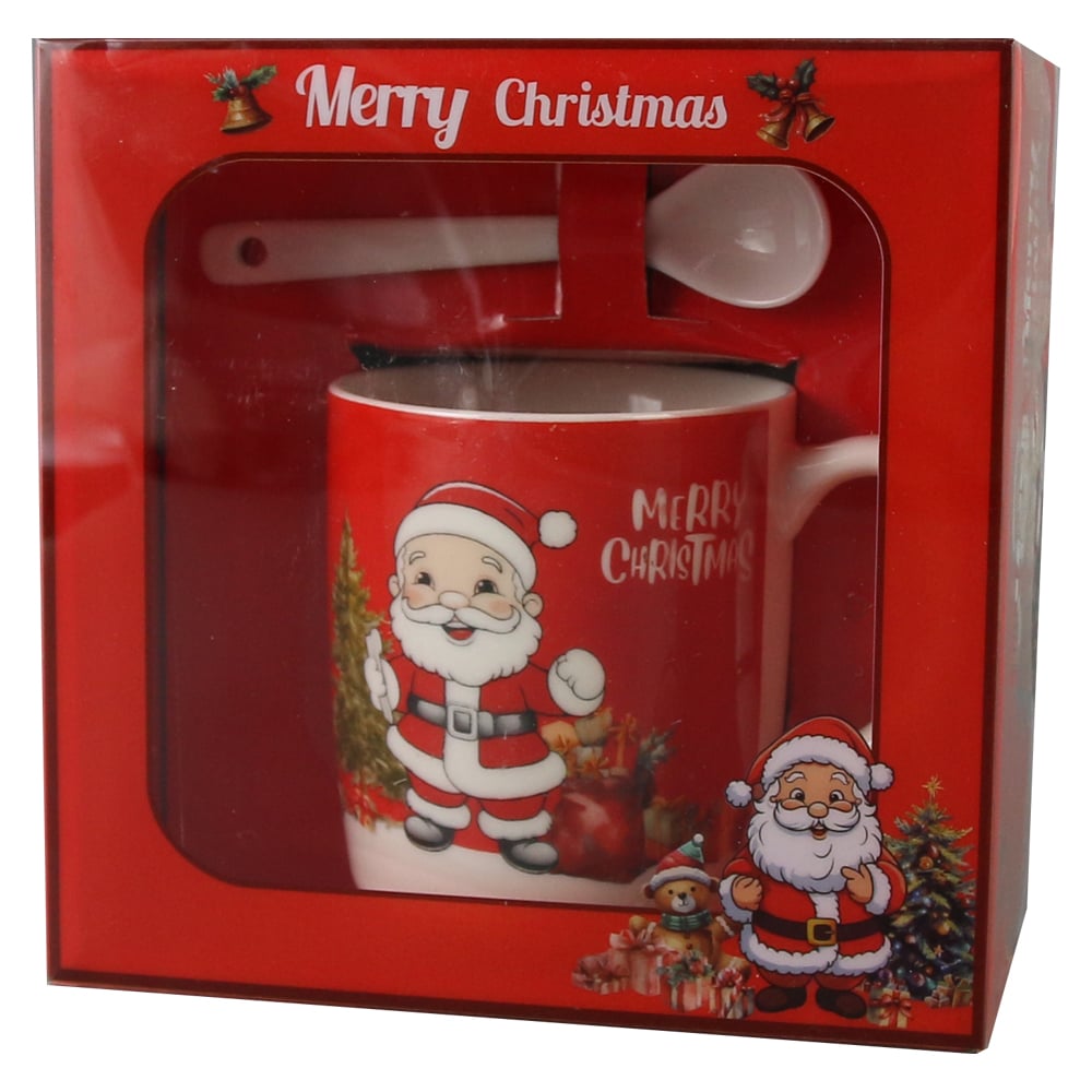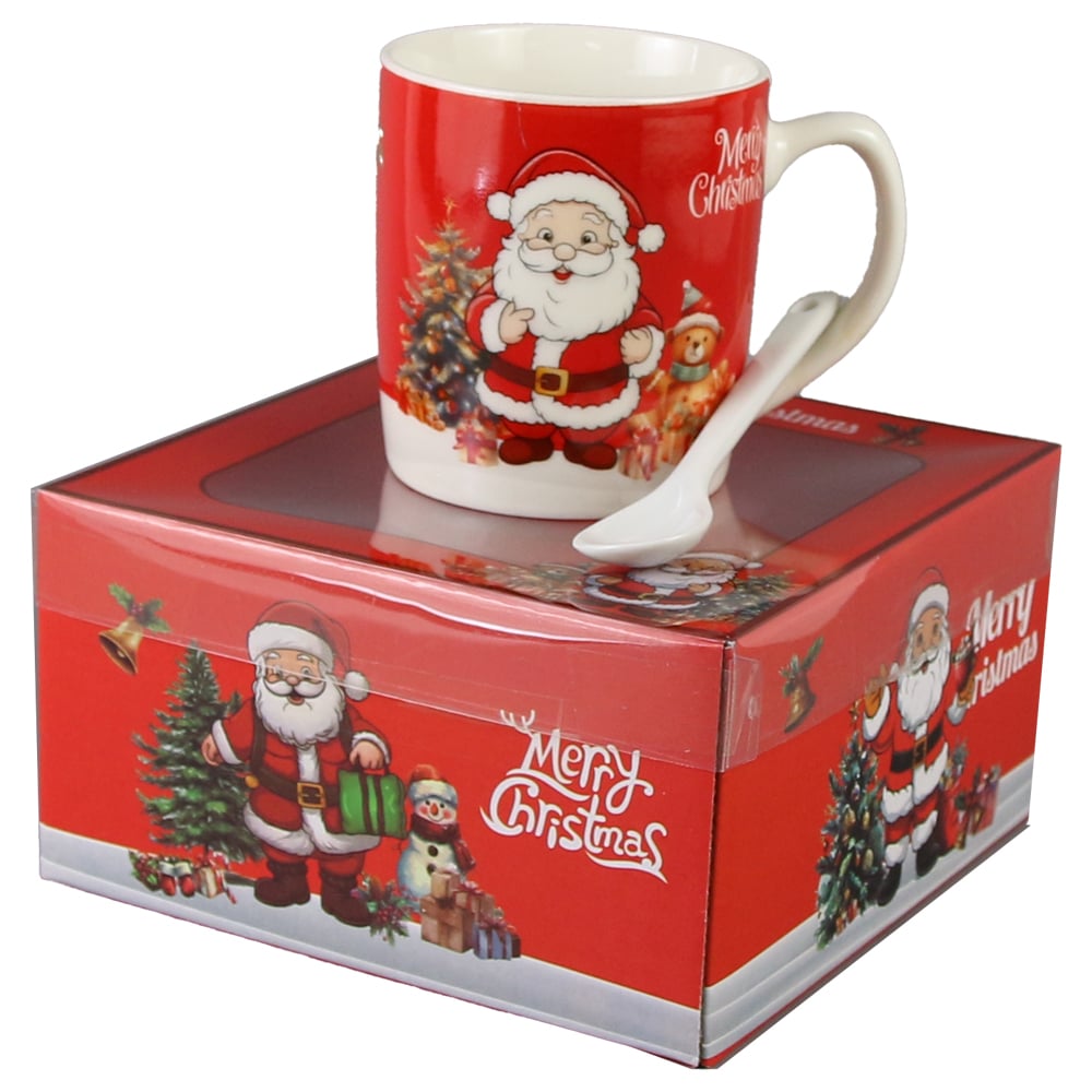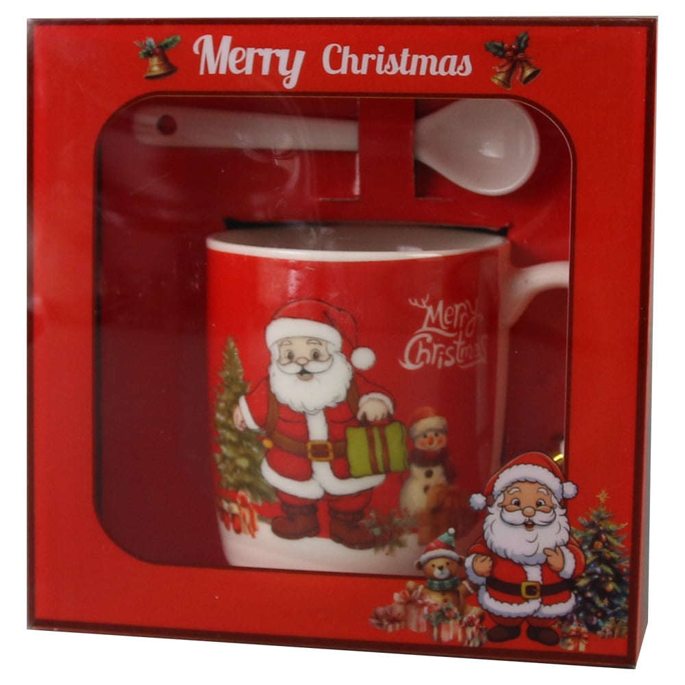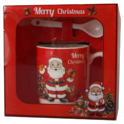 Cana de Craciun cu lingurita, din ceramica, 150 ml, „Merry Christmas”, Mos cu cadouri