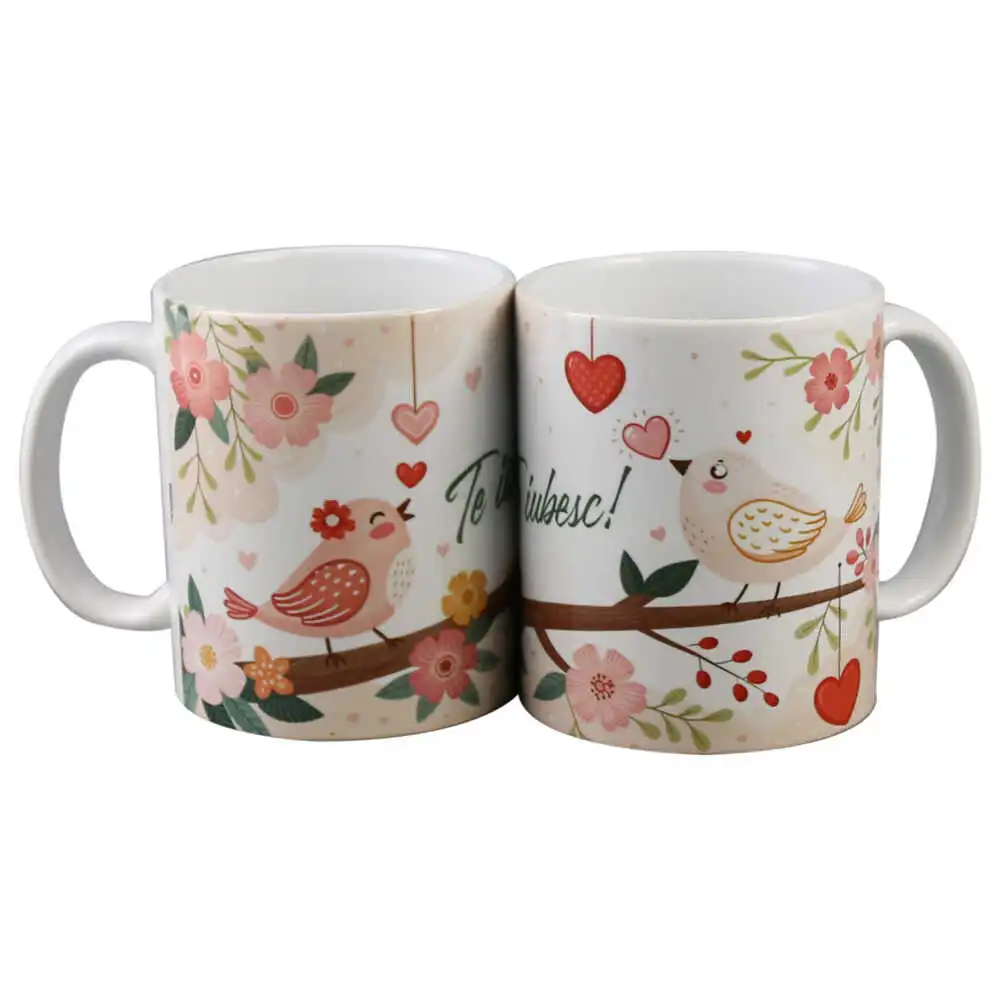 Cana din ceramica, 330 ml, „Te iubesc!”, cu pasari si inimioare