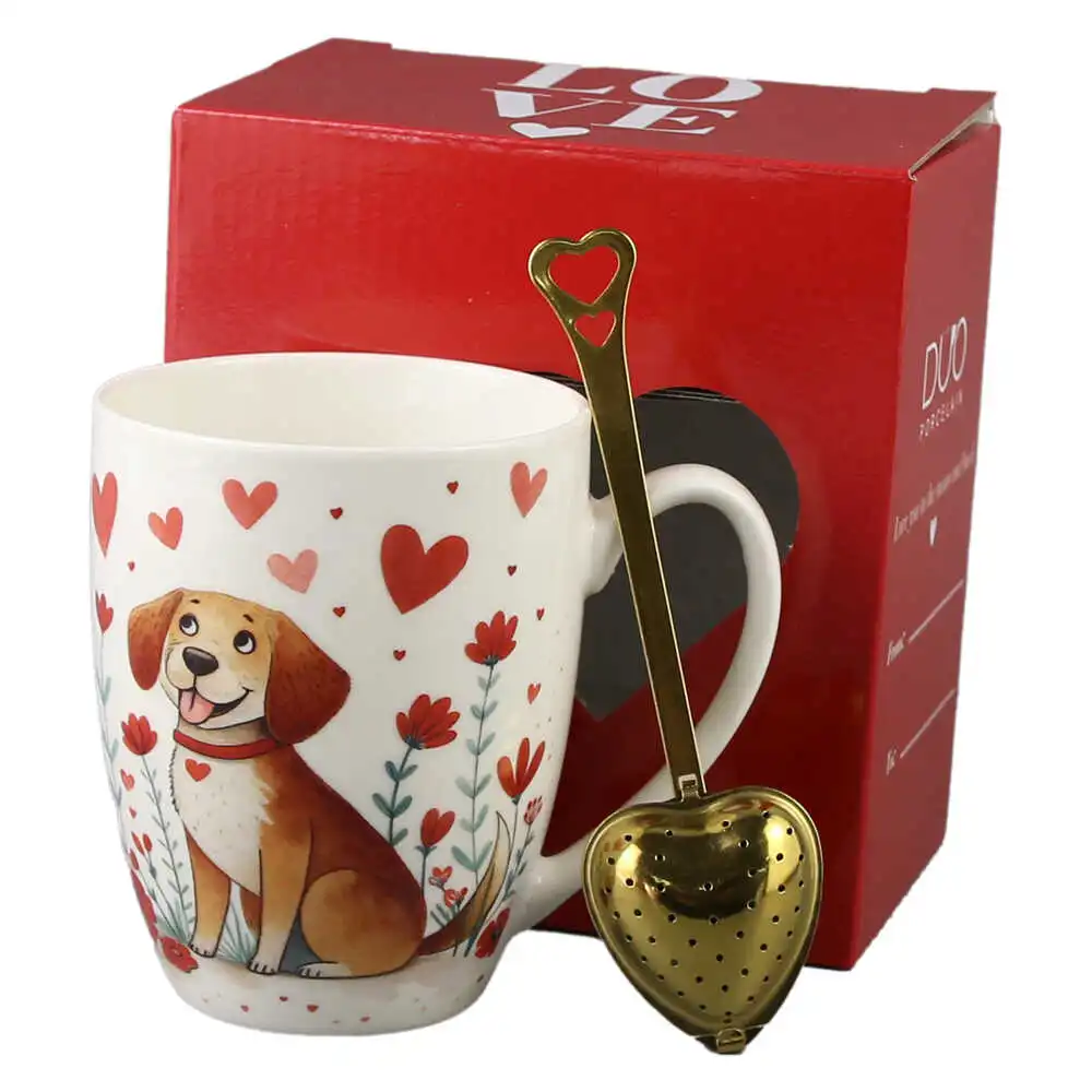 Cana portelan cu infuzor metalic inima, 360 ml, Catel cu inimioare, cu cutie cadou