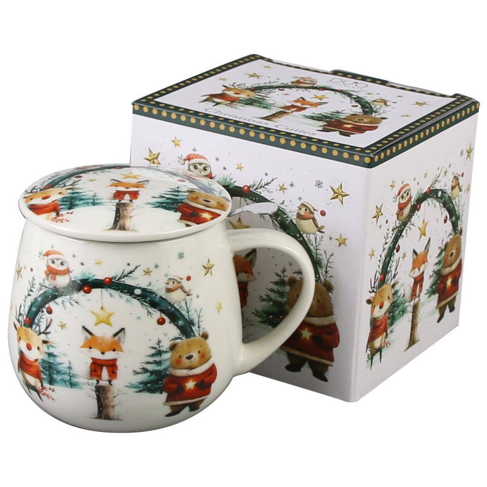 Cana portelan cu infuzor metalic si capac, Christmas Cuties, 430 ml, in cutie decorativa, Animalute de Craciun