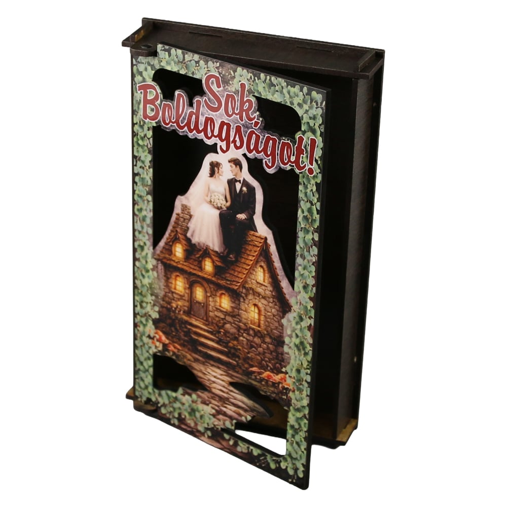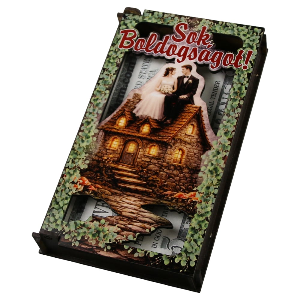 Caseta cadou din lemn pentru bani „Sok Boldogsagot!” 17.5 x 10 cm