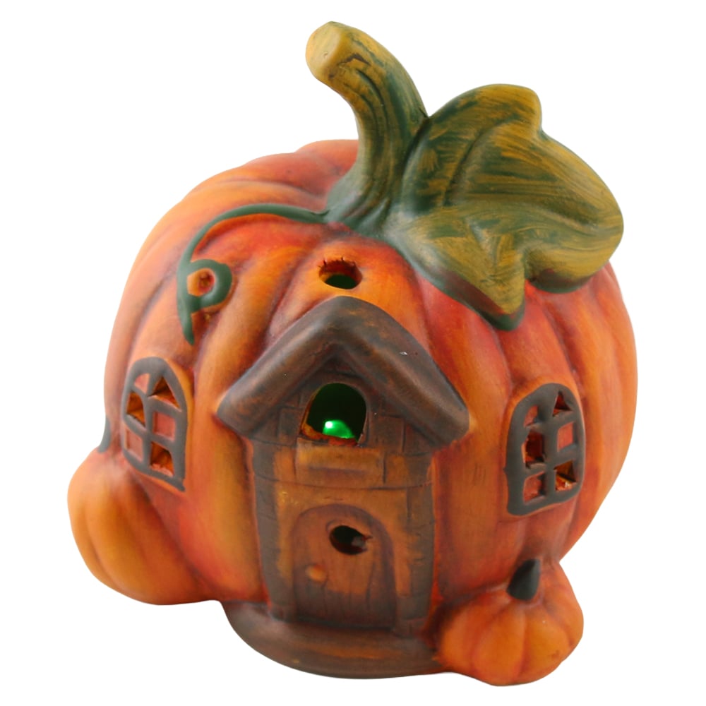 Casuta decorativa in forma de dovleac, realizata din ceramica, cu iluminare LED, inaltime 11 cm. Ideala pentru decor interior de sezon sau cadou.