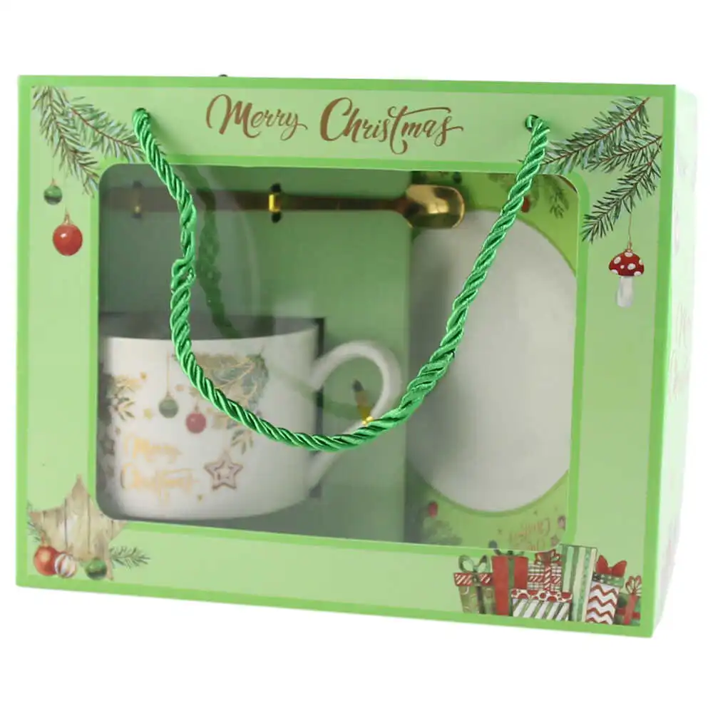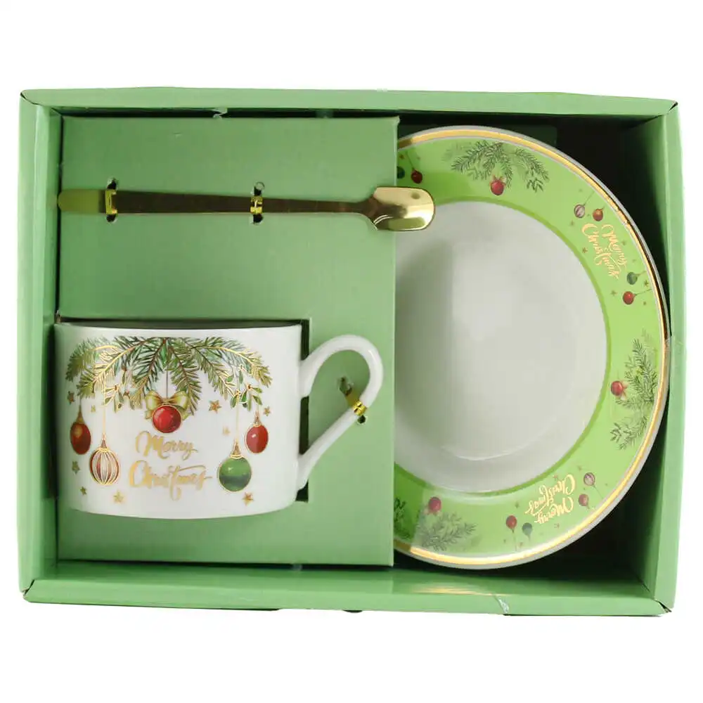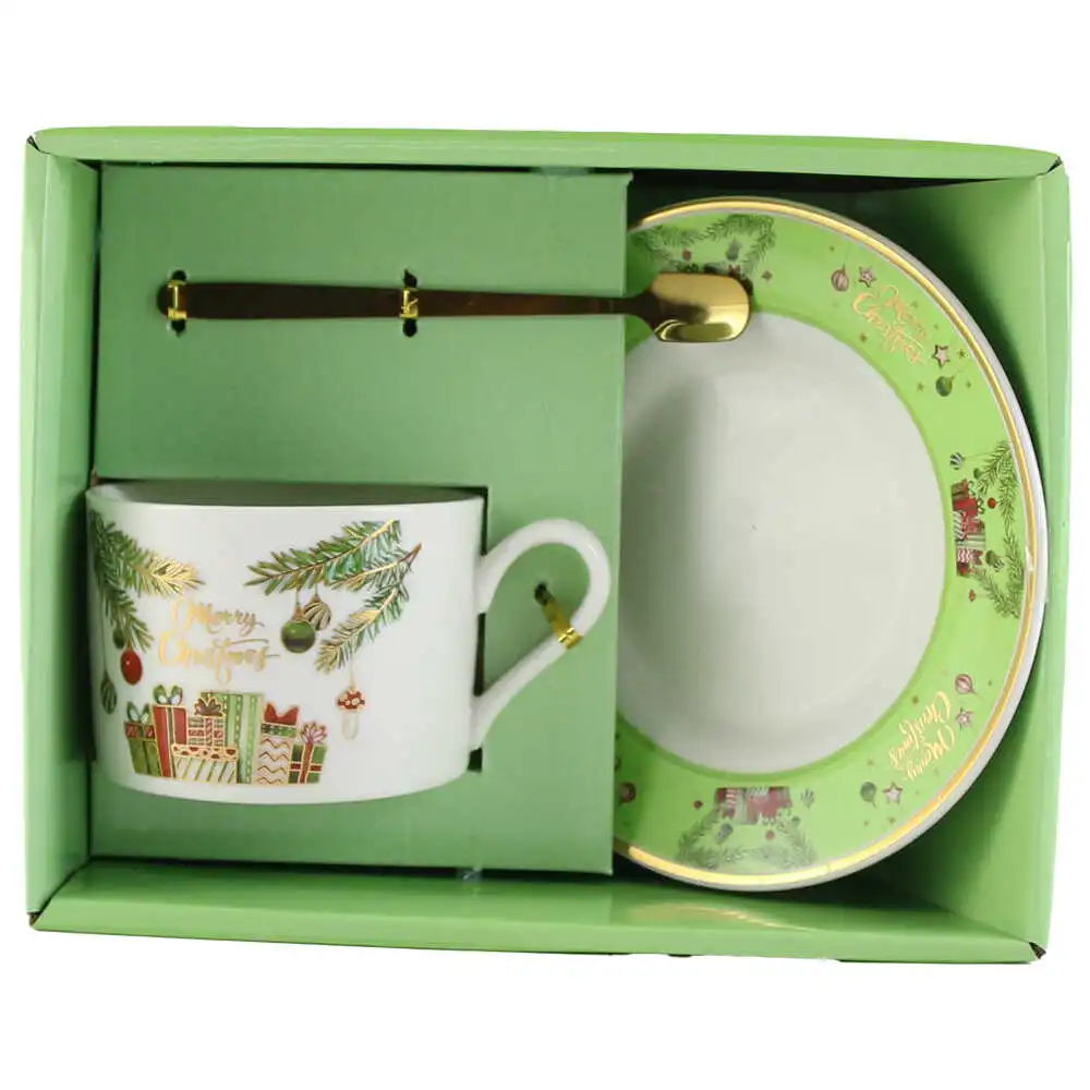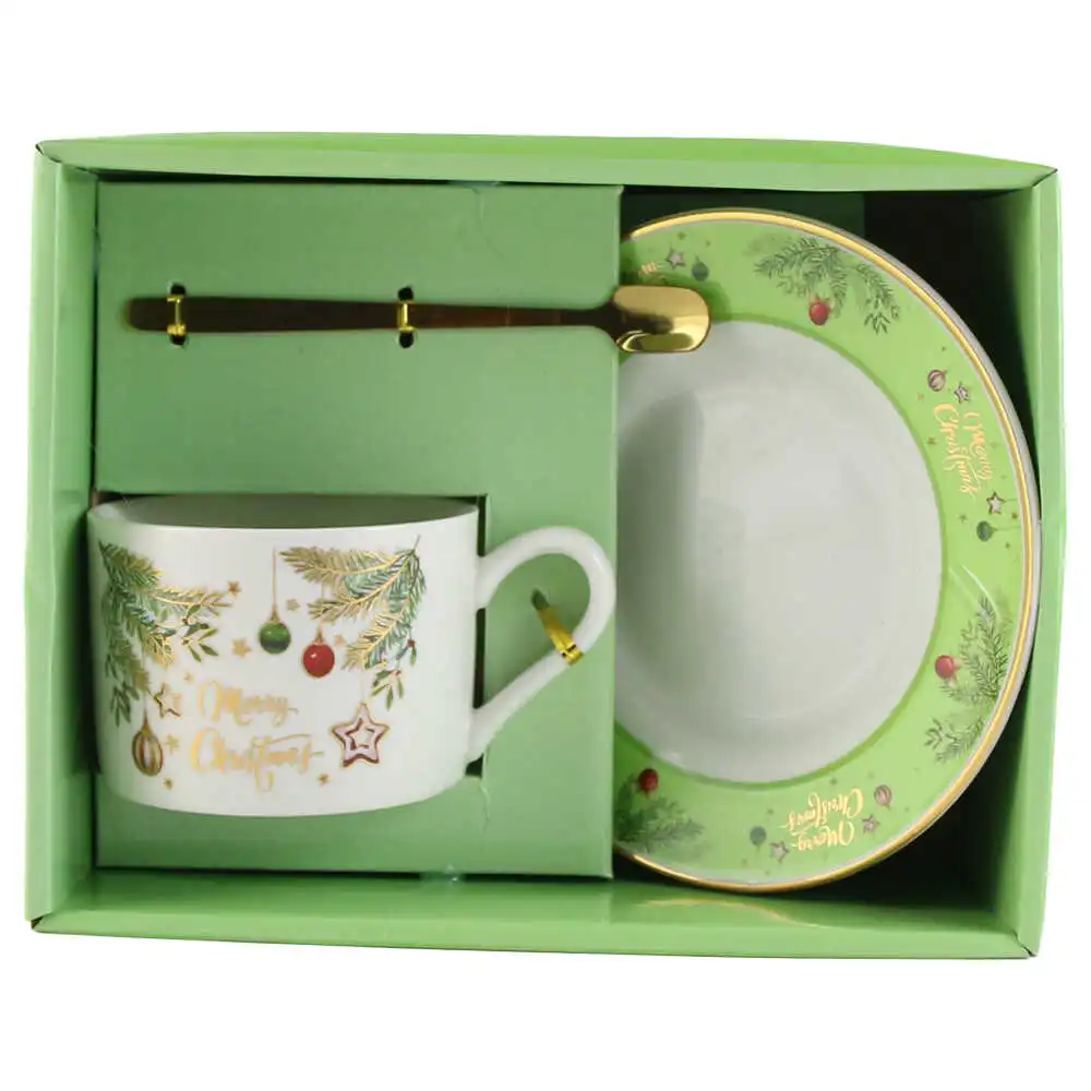 Ceasca si farfurioara Craciun cu lingurita metalica „Merry Christmas”, verde