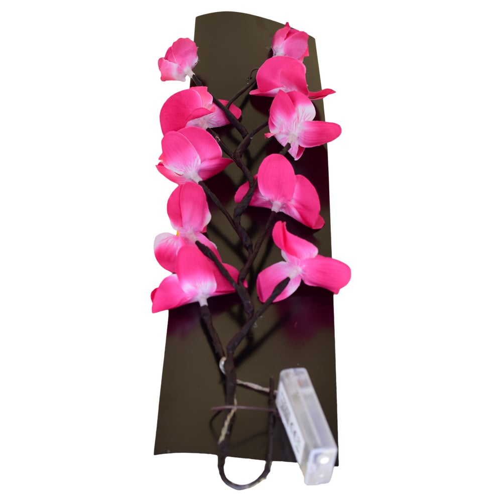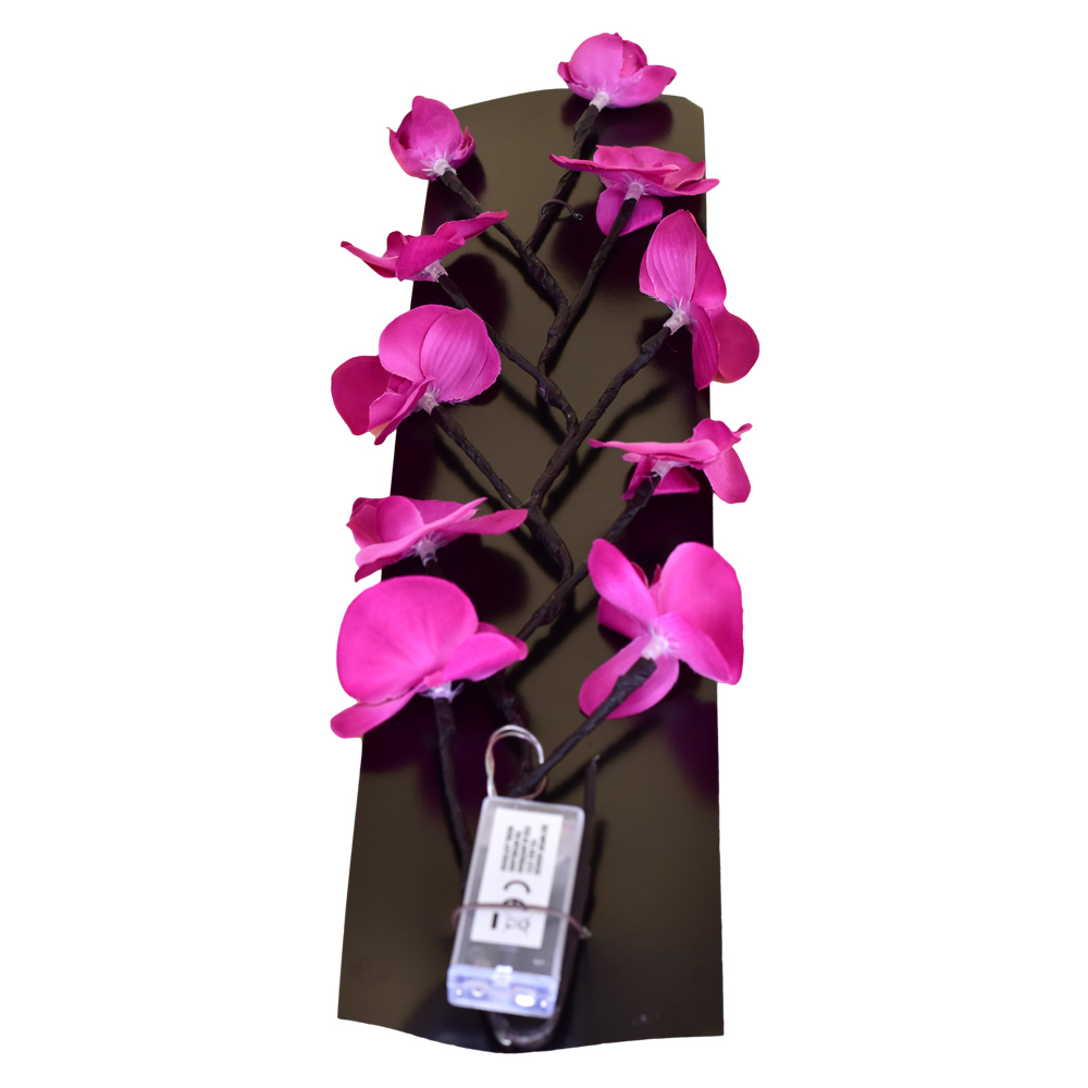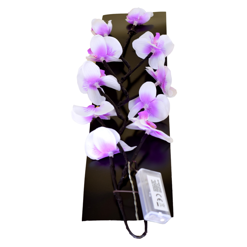 Aceasta creanga decorativa cu flori de orhidee este realizata din plastic. ideala pentru a fi expusa in vaza. completand astfel decoratiunea interiorului. Este dotata cu led. putand fi astfel folosit ca sursa de lumina discreta. perfecta pentru o seara de