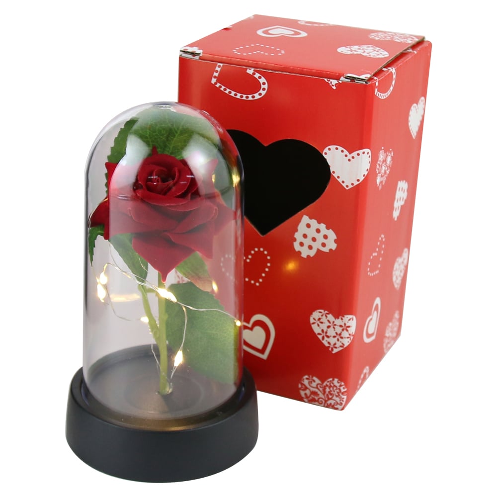 Cupola inimioara cu trandafir rosie si LED, 15 cm, cu cutie de cadou