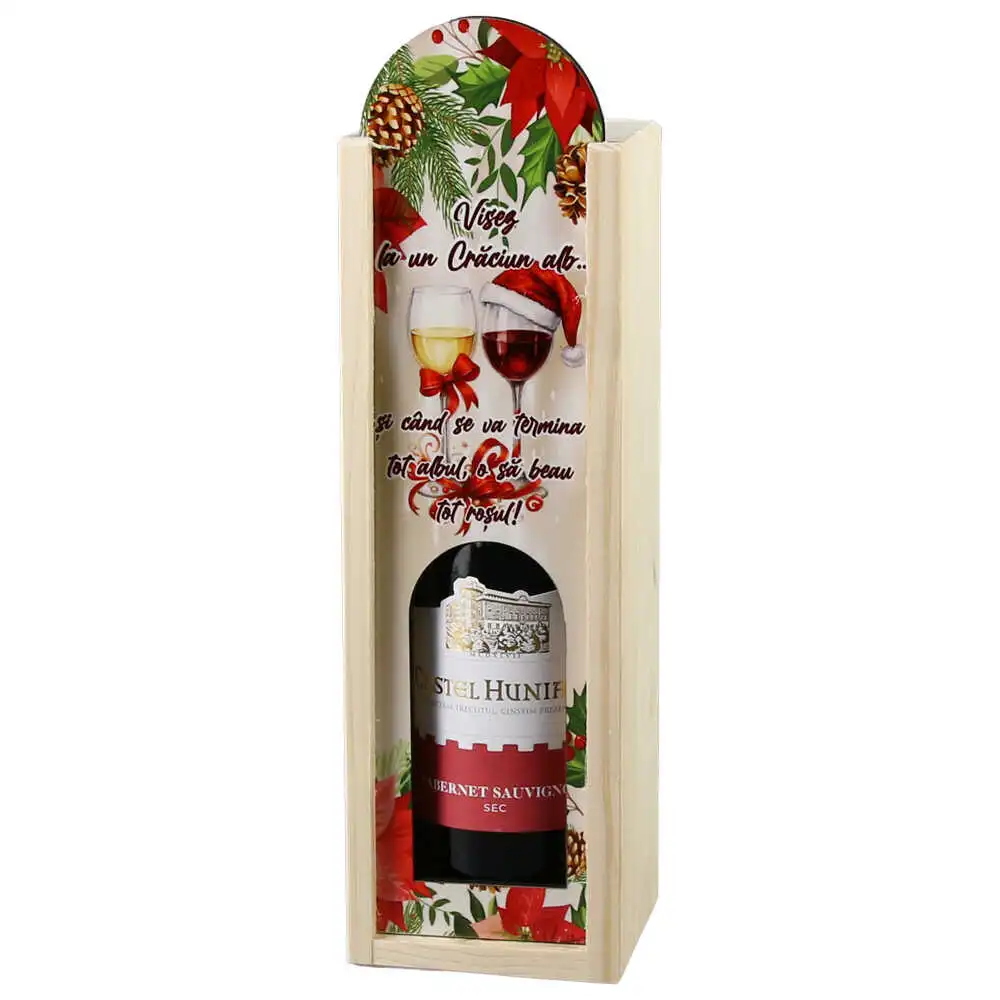 Cutie din lemn cu o sticla vin 187 ml, „Visez la un Craciun alb…”7×24 CM