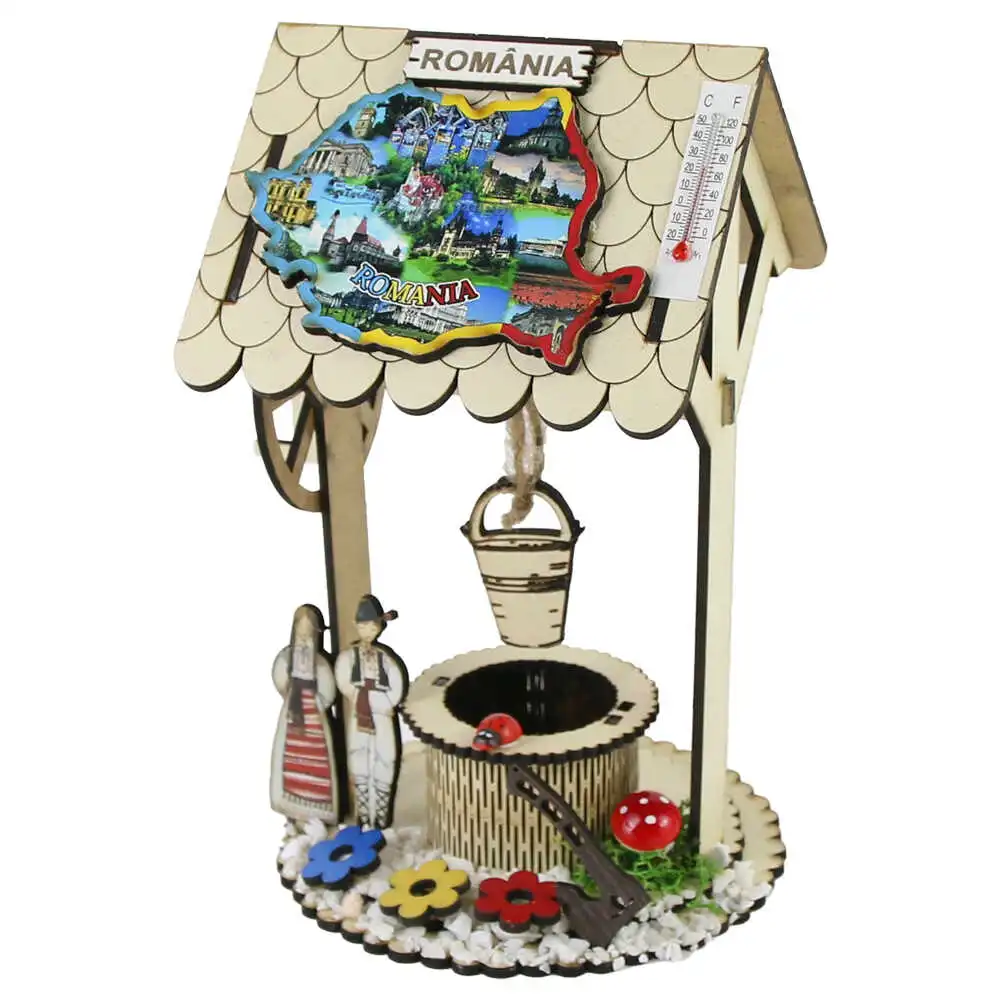 Decor lemn Fantana „Romania” 12×20 CM, cu termometru