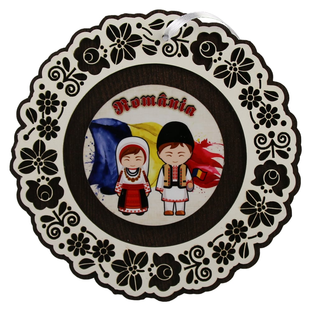 Decoratiune de perete realizata din lemn, cu dimensiunea de 18.5 cm, reprezentand copii imbracati in port traditional, cu tematica „Romania”. Ideala pentru decor interior sau ca suvenir traditional.