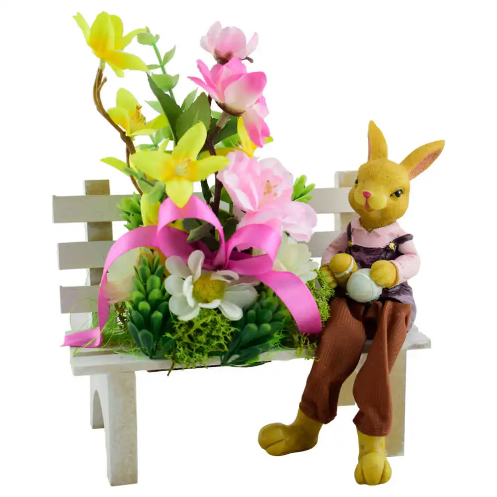 Decoratiune pentru Pasti in forma de bancuta decorata cu flori si iepuras