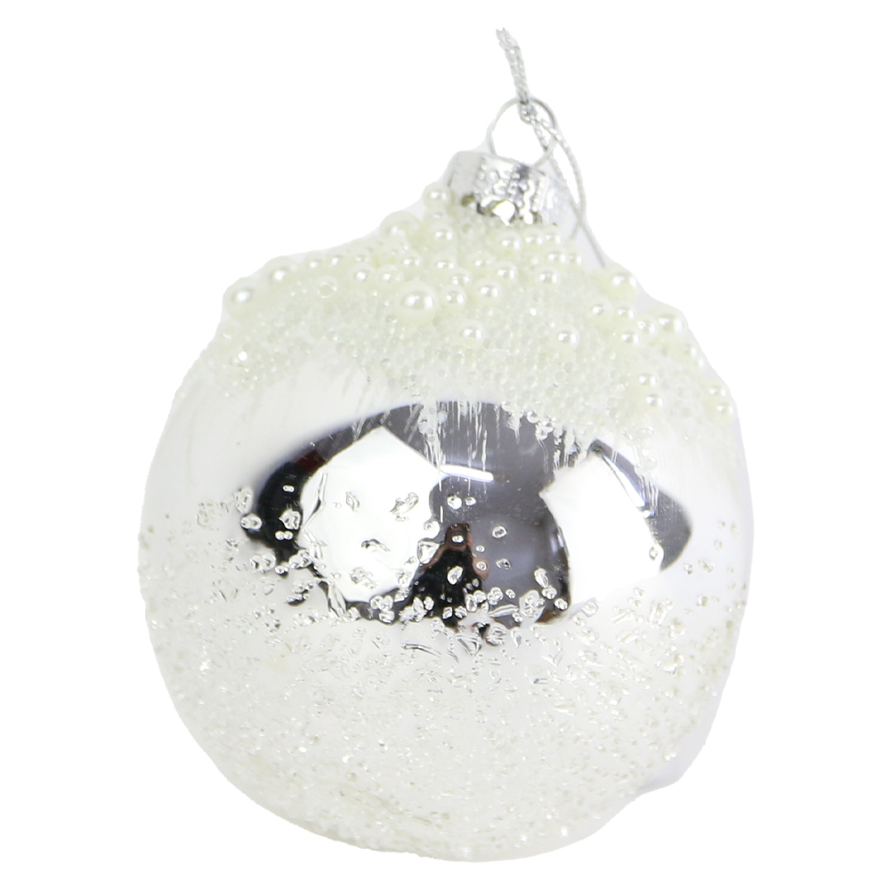 Glob pentru brad din sticla cu margele 8 CM, Alb/argintiu