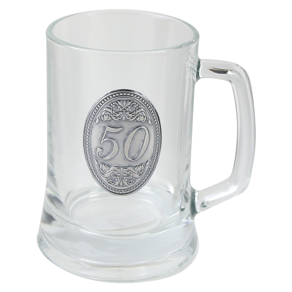 Halba de bere de 500 ml cu design tip pub, decorata cu o emblema metalica in relief ?50?, fixata pe suprafata halbei. Relieful se simte la atingere, oferind un efect elegant si premium.