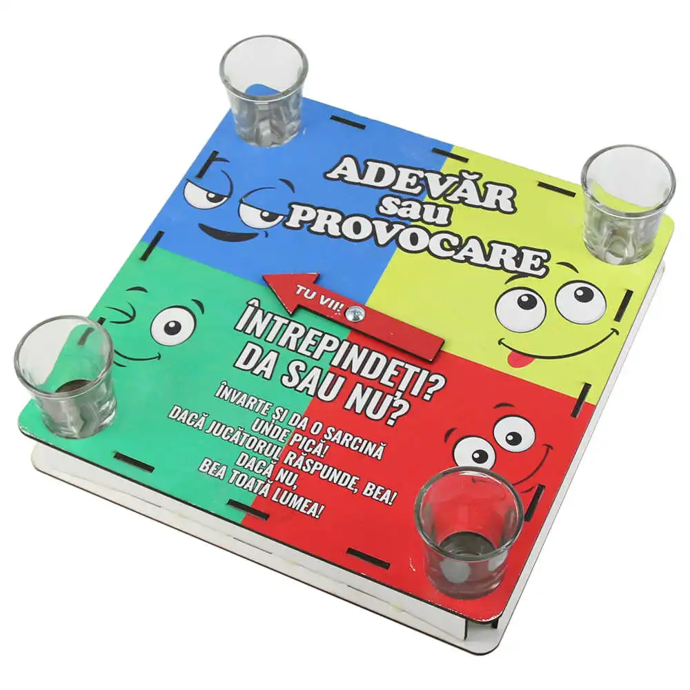 Joc de baut cu 4 pahare shot „Adevar sau Provocare” 25×25 CM