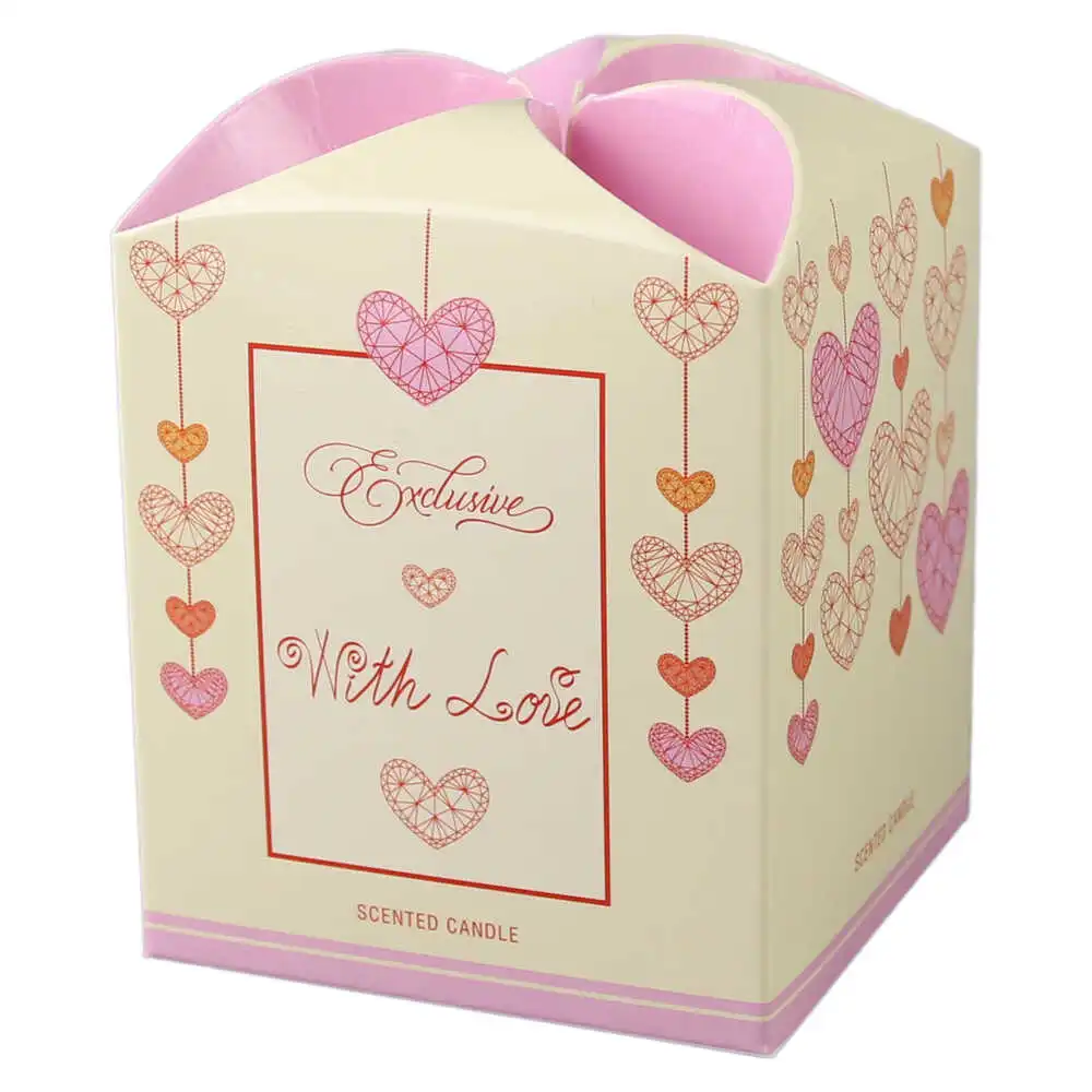 Lumanare decorativa parfumata in pahar, ideala pentru cadouri romantice sau pentru a crea o atmosfera speciala, cu design cu inimioara.