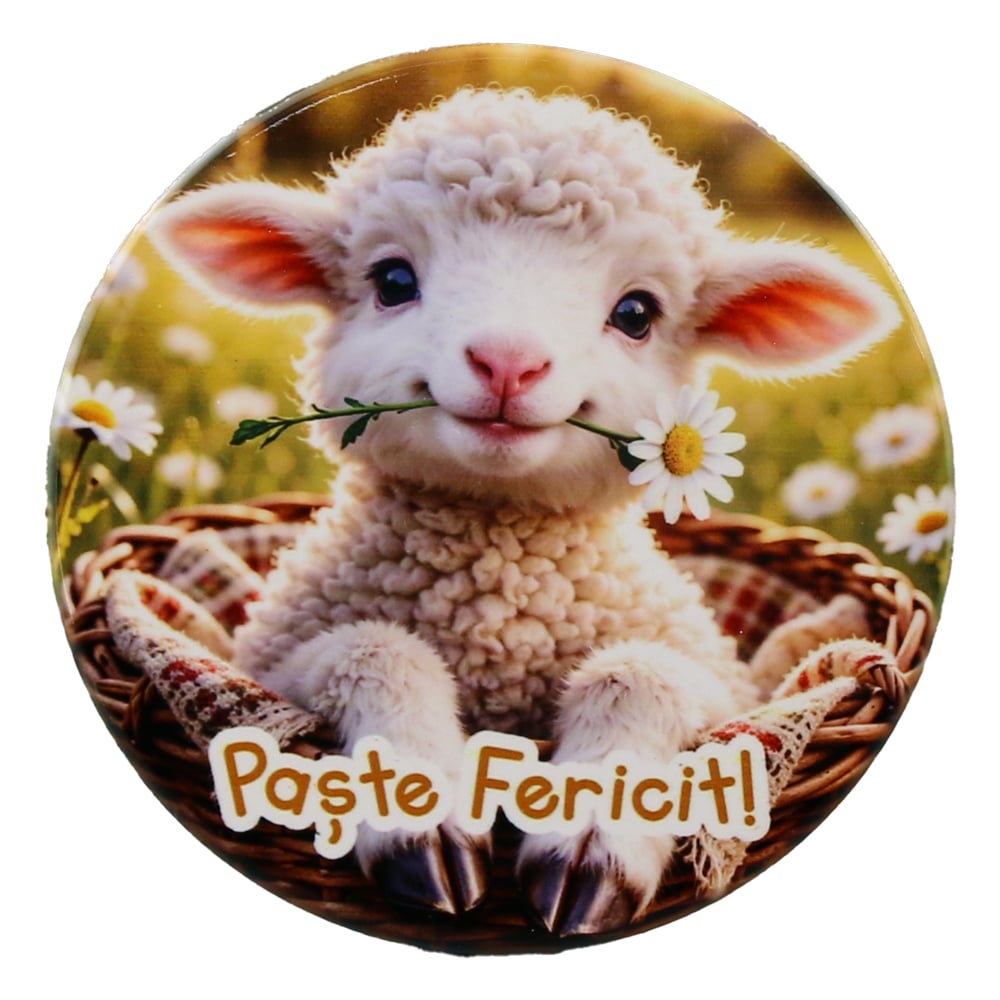 Magnet decorativ din ceramica cu diametrul de 8 cm, ilustrand un miel simpatic si mesajul „Paste Fericit!”. Ideal pentru a inveseli frigiderul sau alte suprafete metalice in perioada sarbatorilor pascale.