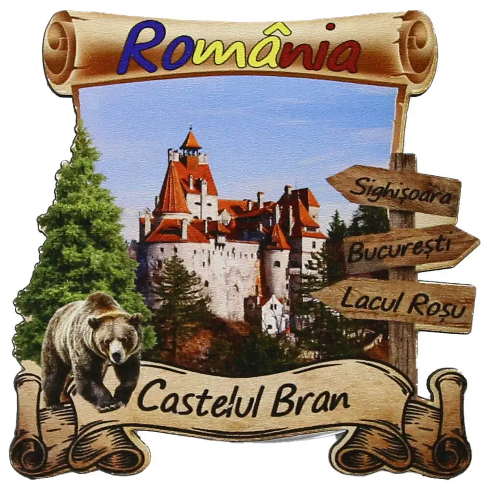 Magnet frigider din lemn „Castelul Bran” 8×8 CM, Romania, urs