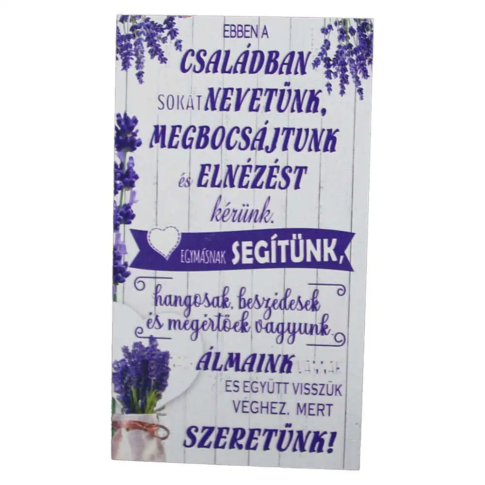 Magnet frigider din lemn „Ebben a csaladban sokat nevetunk…” 8×14 CM
