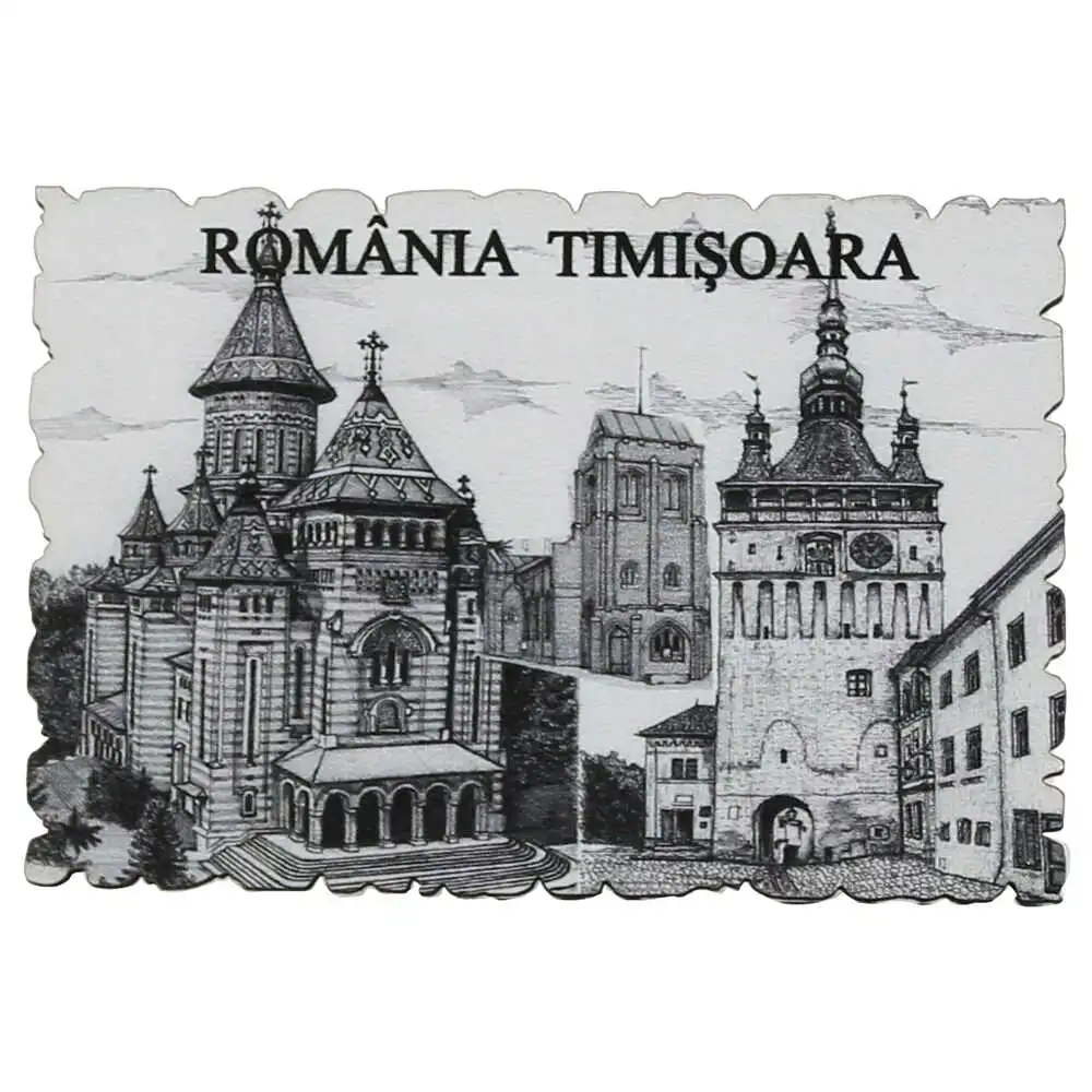 Magnet frigider din lemn „Romania” 9×6 CM, Timisoara, alb/negru