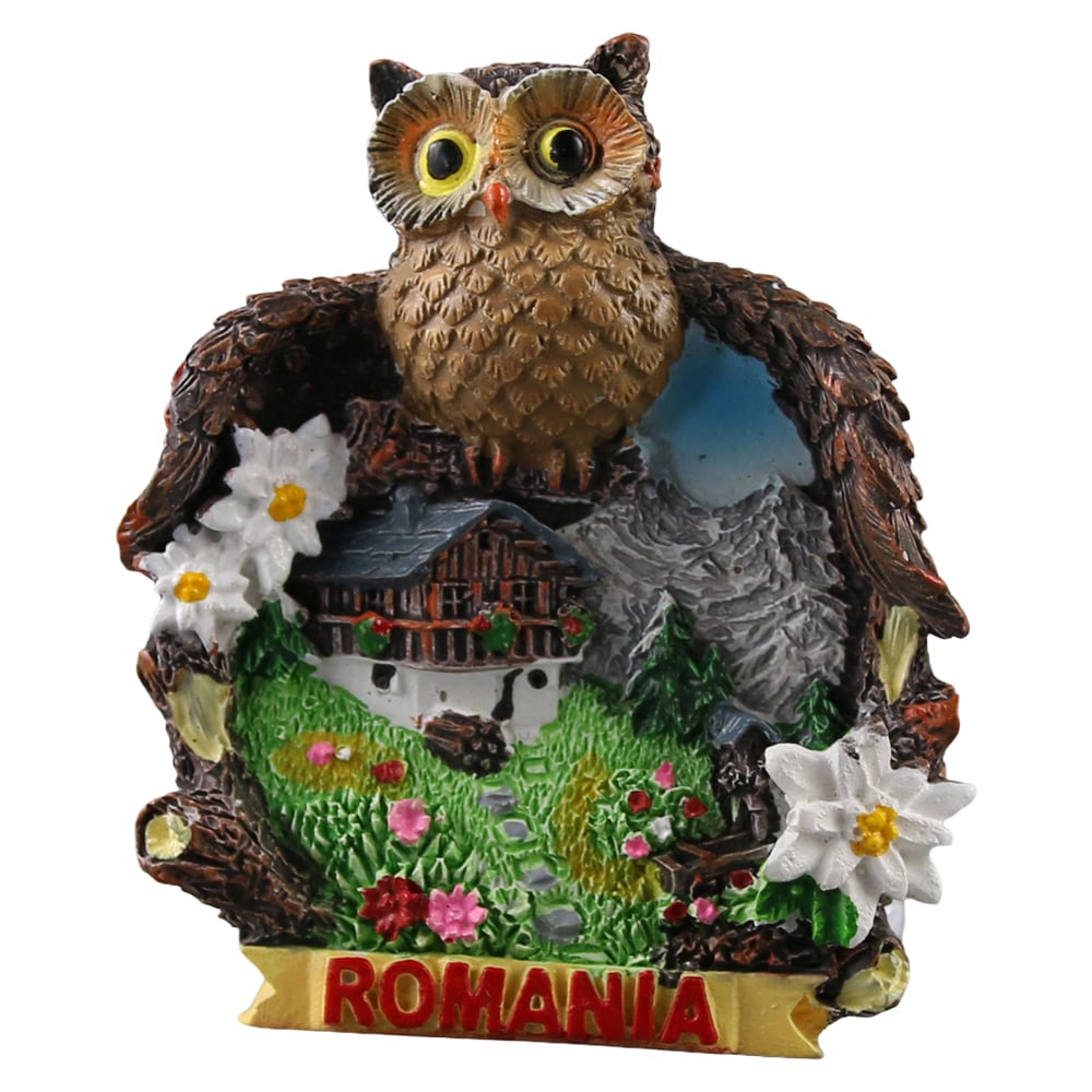 Magnet pentru frigider din rasina, dimensiuni 6 x 7 cm, cu inscriptia „Romania” si model Bufnita. Ideal pentru decor sau suvenir.