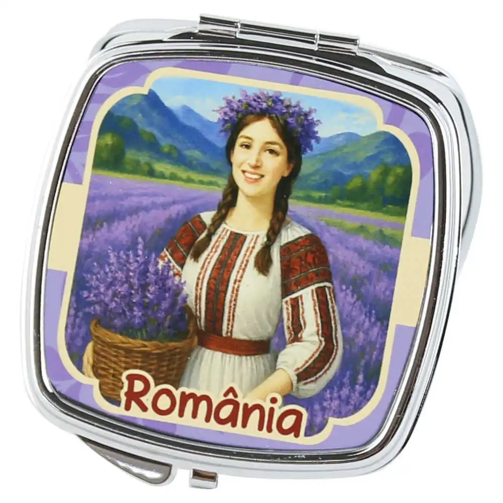 Oglinda de buzunar, „Romania”, tarancuta cu lavanda, 6×7 CM