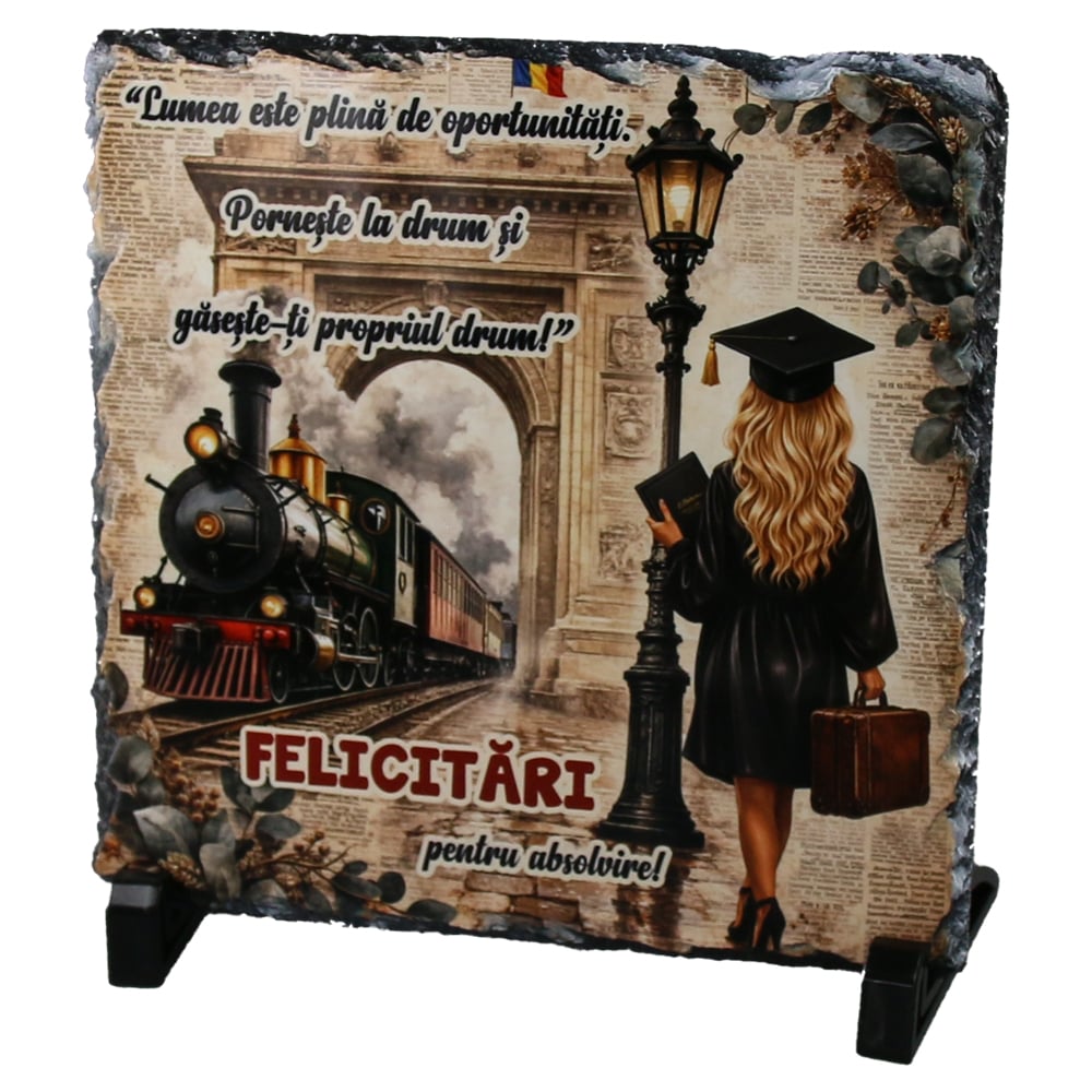 Placa ardezie „Lumeas este plina de oportunitati…Felicitari pentru Absolvire!” 19 x 19 cm