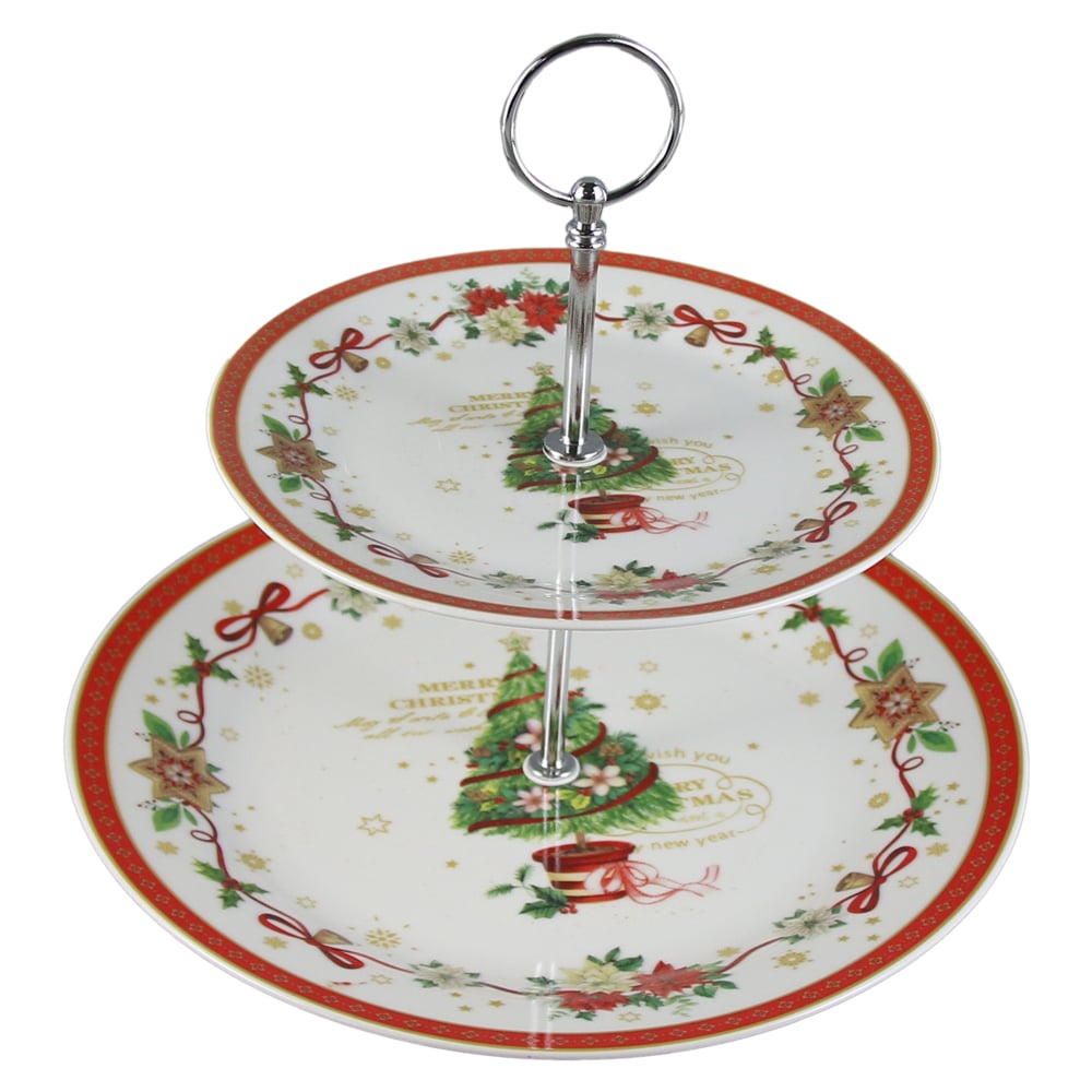 Platou etajat cu 2 nivele, din ceramica, „Merry Christmas” Brad, in cutie decorativa