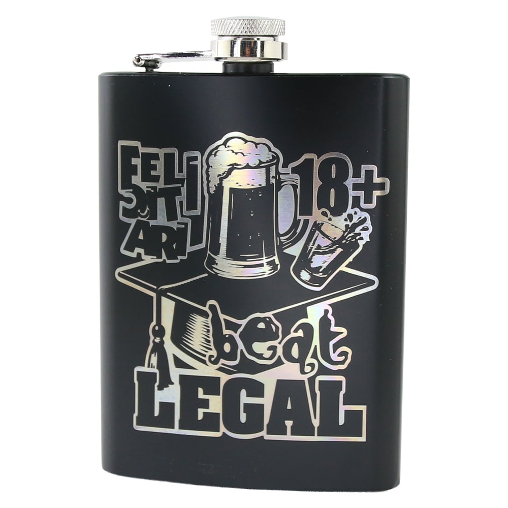 Plosca metalica gravata, capacitate 220 ml, cu mesaj „Felicitari 18+ Beat legal”. Ideala pentru cadou amuzant la majorat sau alte ocazii speciale.