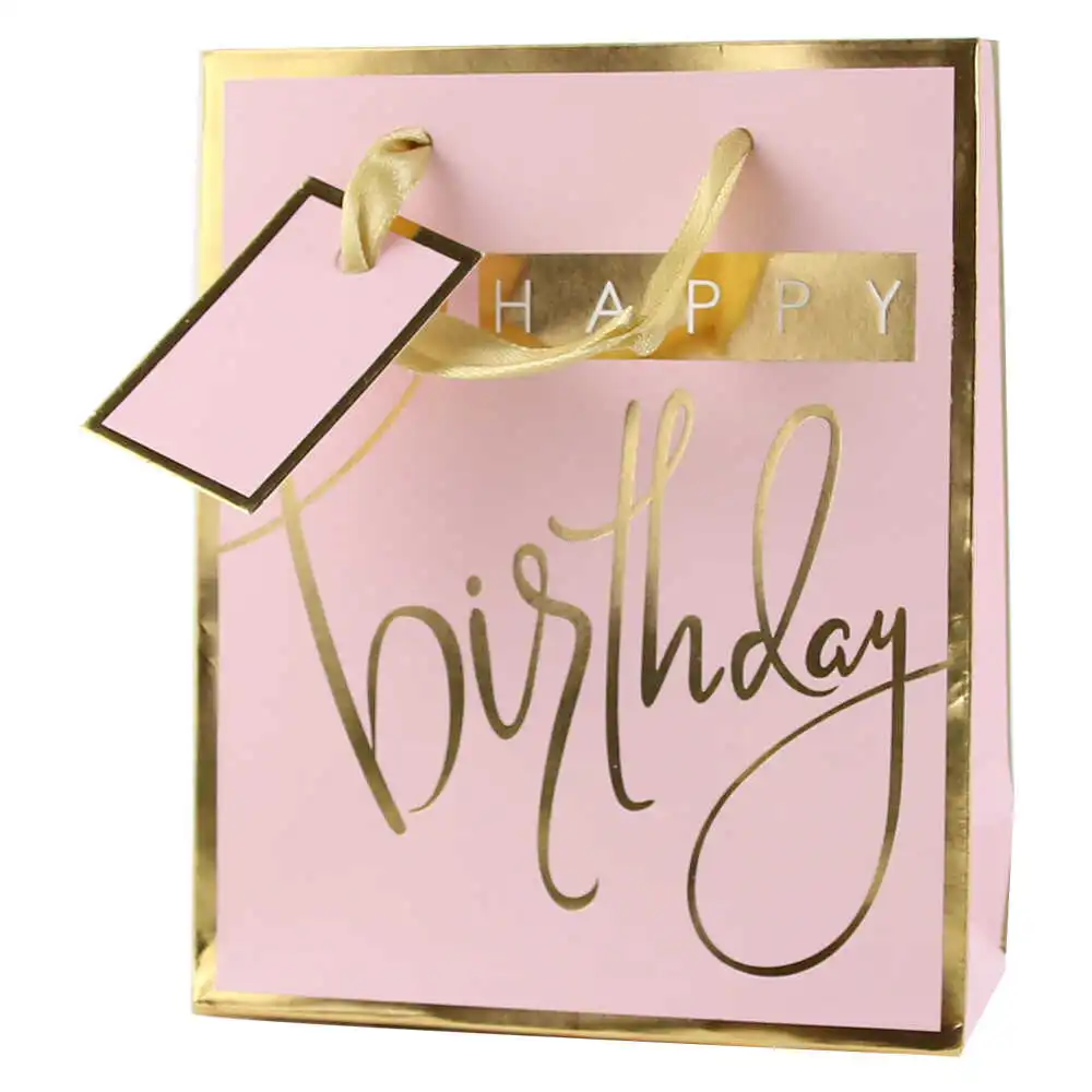 Punga cadou din hartie 11×14 CM, „Happy Birthday”, roz, cu eticheta