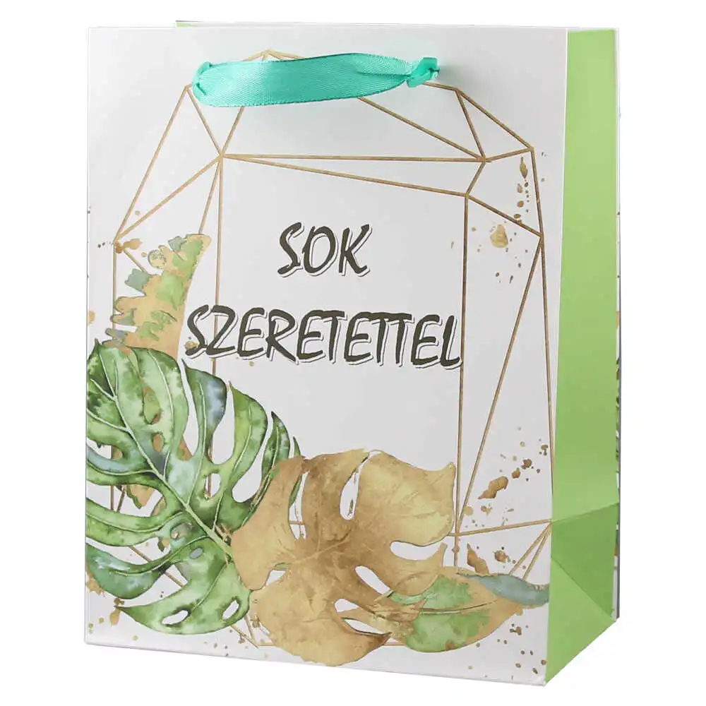 Punga cadou din hartie 18×23 cm, „Sok szeretettel”, frunze verzi