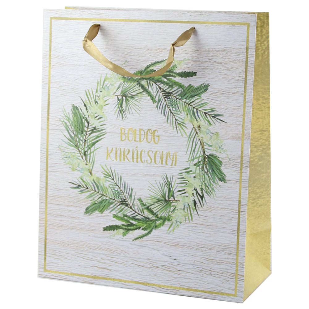 Punga cadou din hartie 26×32 CM „Boldog Karacsonyt”, coronita de pin