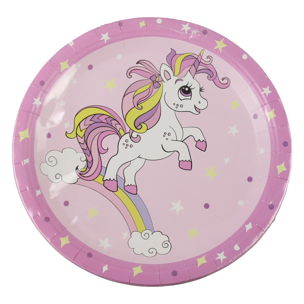 Set de 10 farfurii din hartie, 12 cm, cu design unicorn. Ideal pentru petreceri, aniversari sau evenimente tematice pentru copii.
