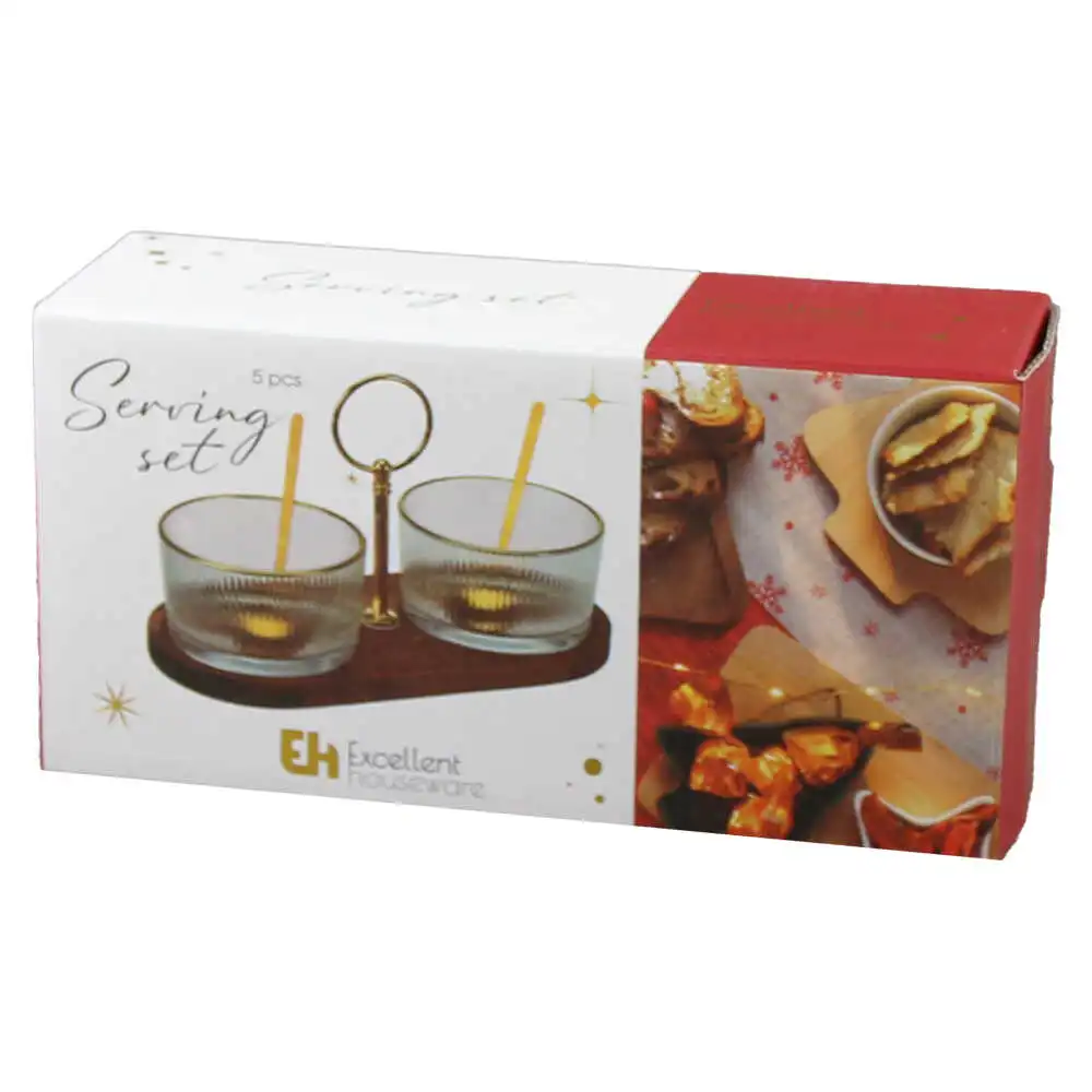 Set 2 boluri din sticla, cu lingurite metalice si suport din bambus 20×9.5 CM, Serving Set
